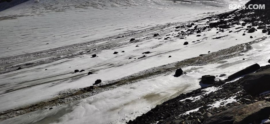 冰川上堆积的冰碛石(拍摄时间:16:02) 继续前行,经过一段平缓冰面,积 雪松软,积水渐深,常没过鞋面。坡度渐陡,融水汇成线状急流,在冰面上切出多条冰河,行走其间,步履维艰。为避风险,我们转至石山下方的碎石坡。刚离开冰面,冰川上方突然涌下混着雪块的急流,从我们身侧奔泻而过,形成一条水量不小的冰河。