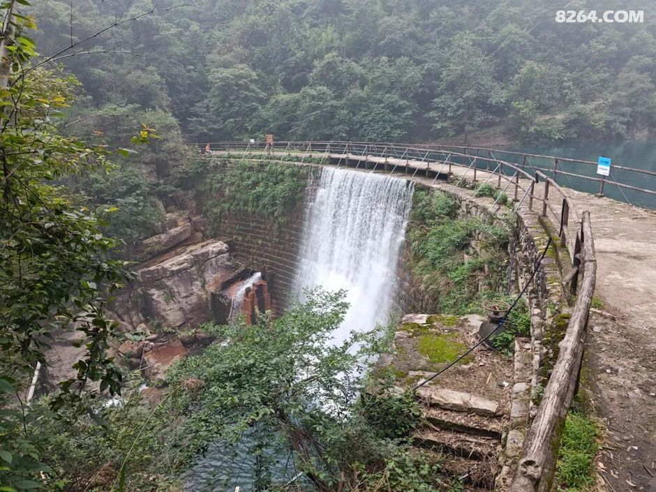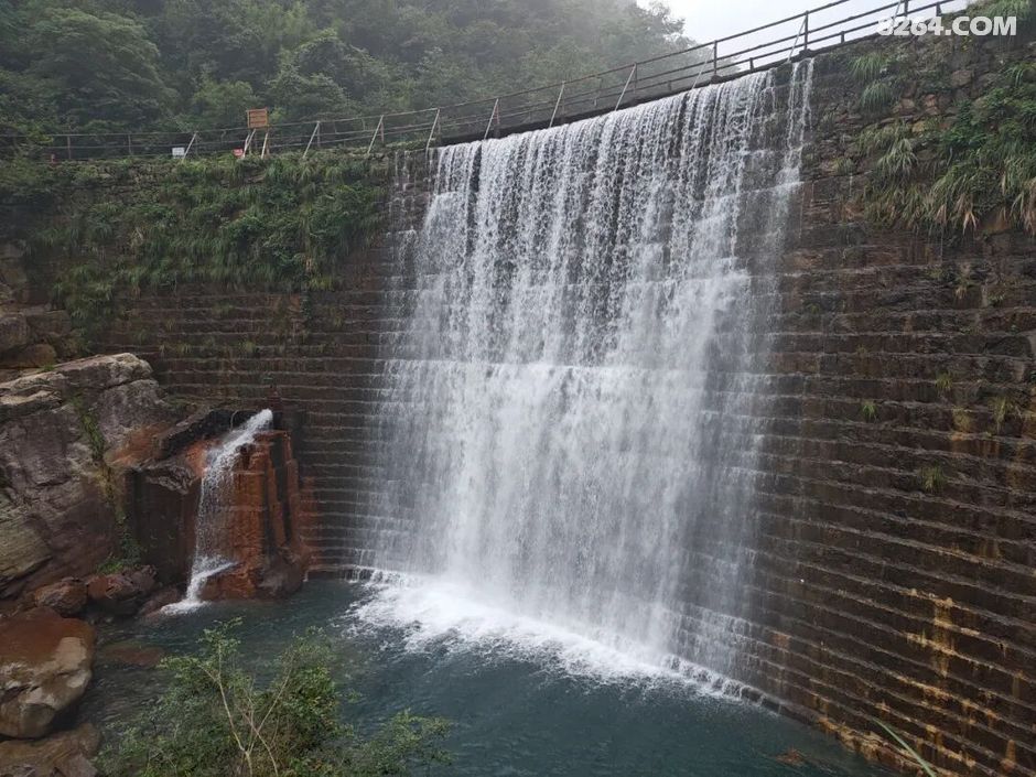 翡翠湖水漫过电站大坝,形成的帘状瀑布。