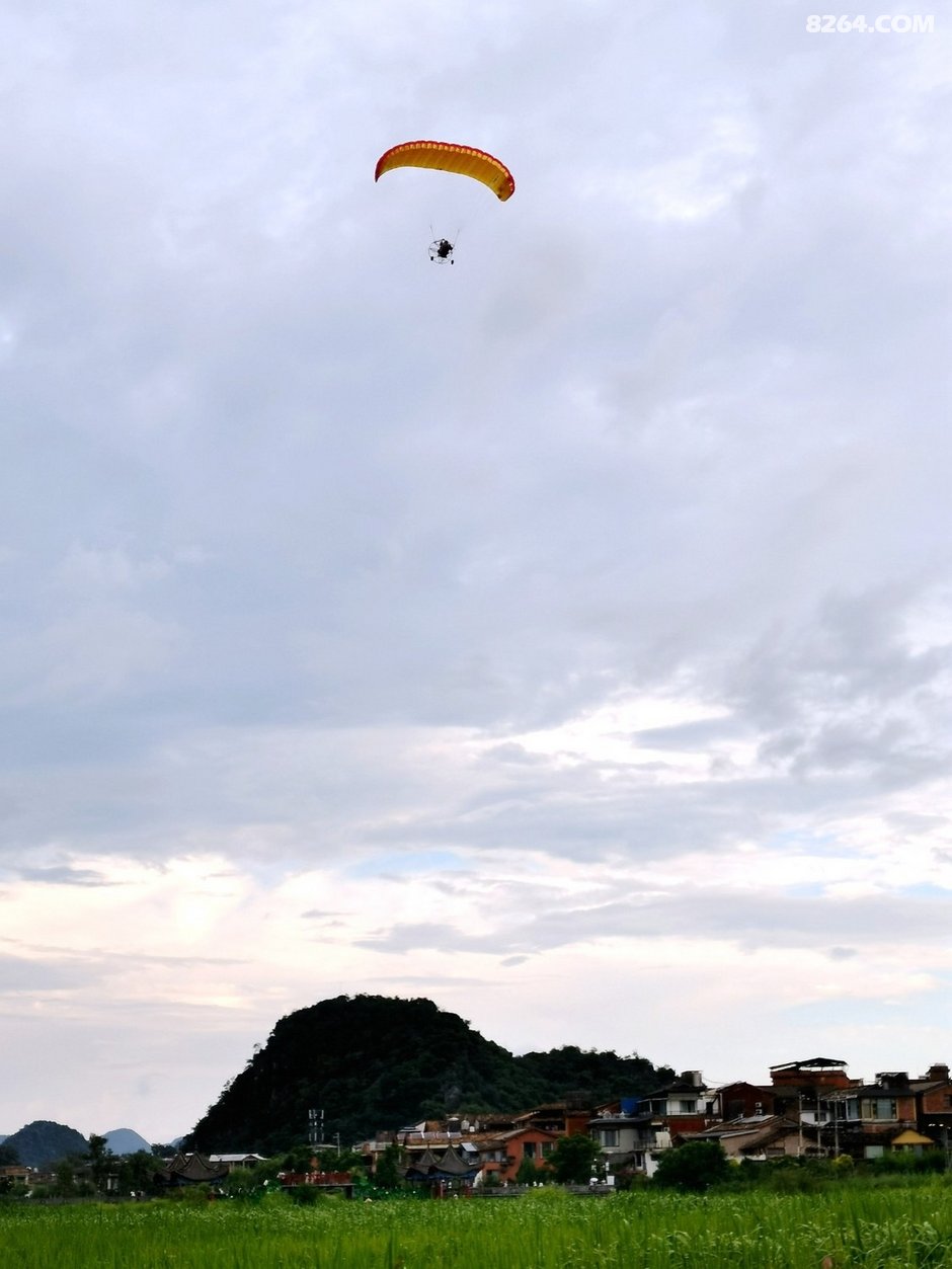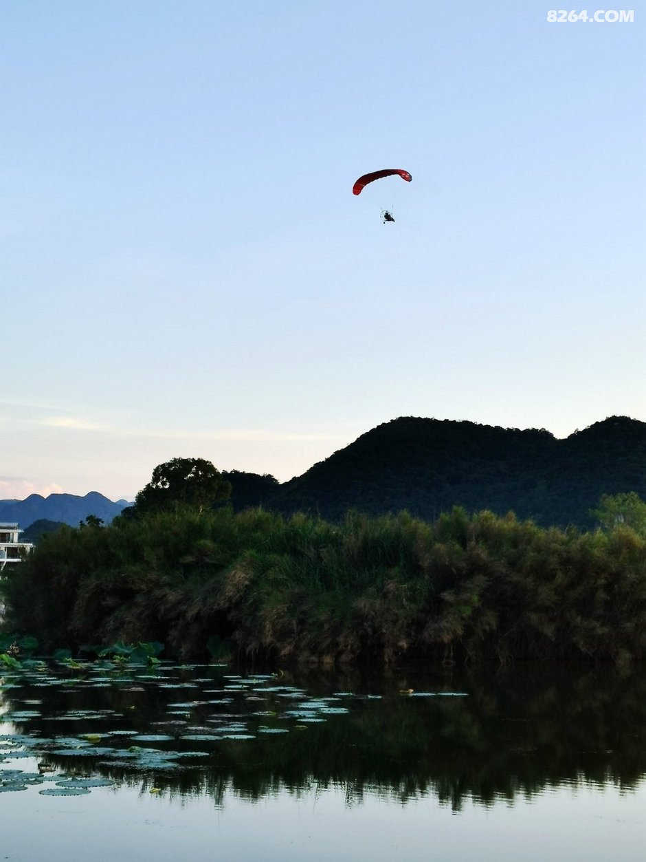 一边吃饭,一边看着天上滑翔机飞过,惬意悠闲。