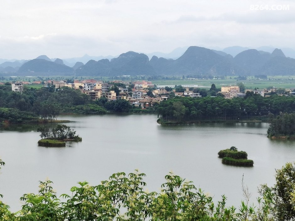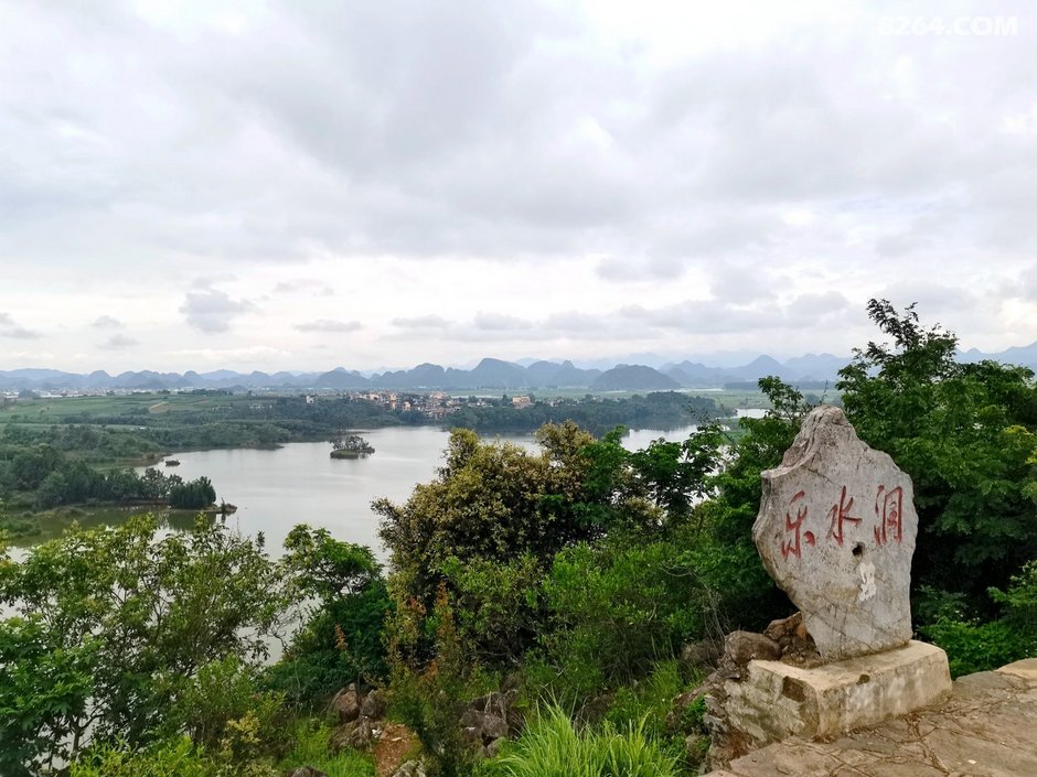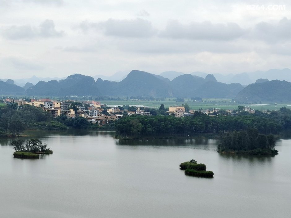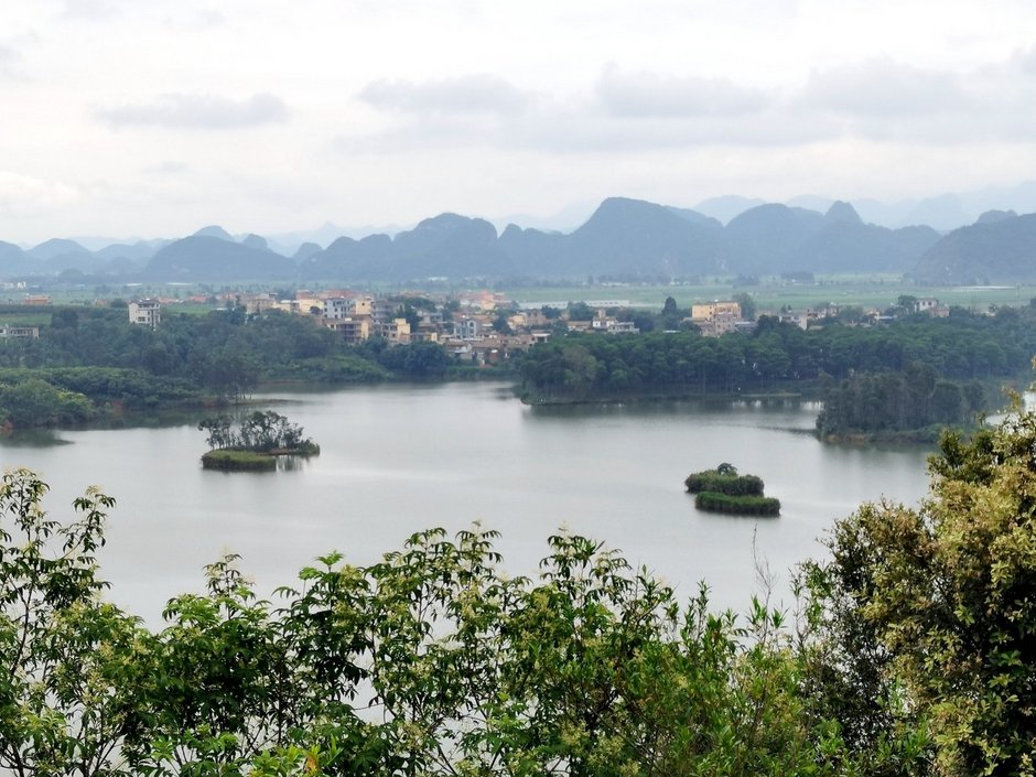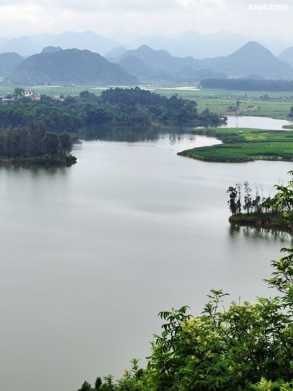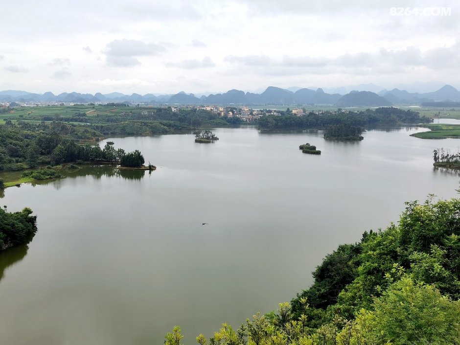 往西北方向离开普者黑景区。经水围营村,绕过落水洞村,沿公路爬到后面与村子隔水相望的半山腰,就可以看到整个落水洞片区的景致了。只见远处峰丛林立,近处水光潋滟,煞是好看。