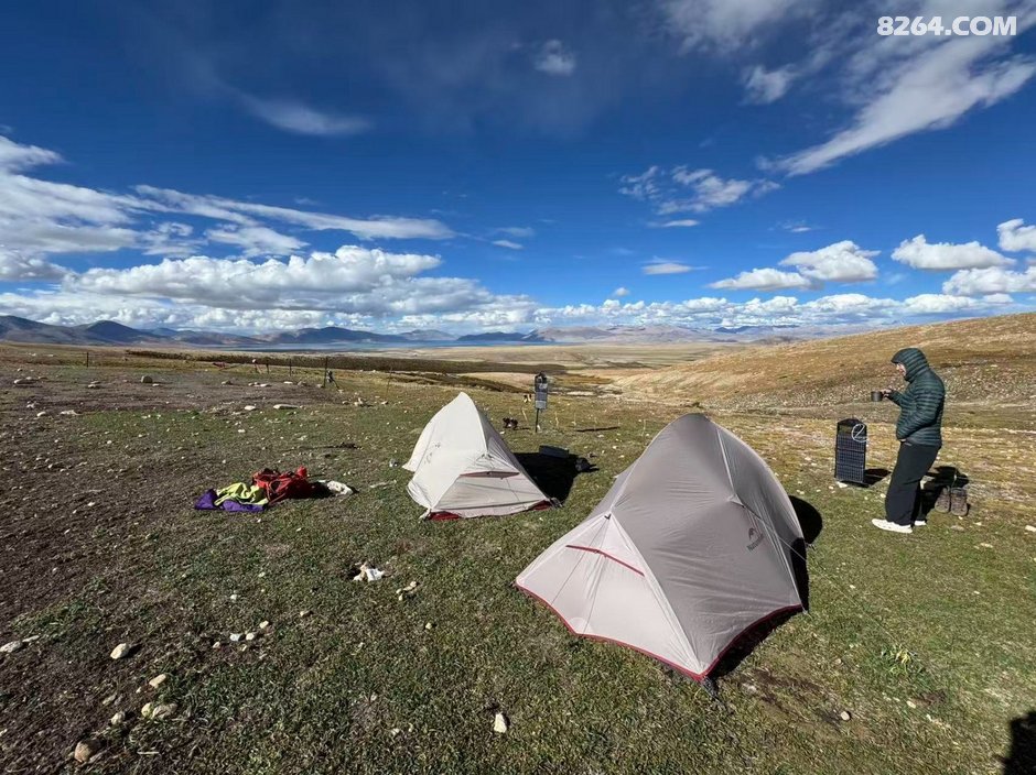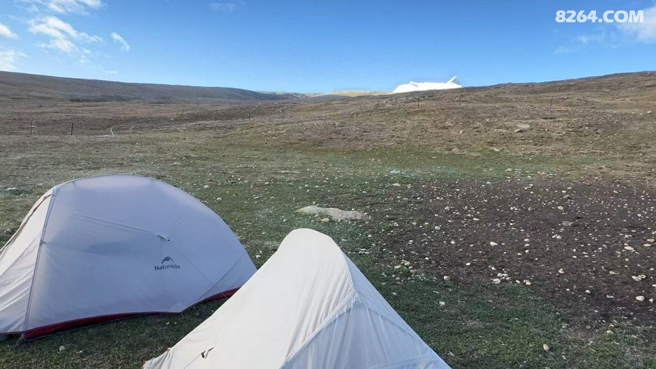 ,拼车的队友背的都是 神秘农场,感觉包鼓鼓的应该装了很多东西很重的样子,走的也比较慢,渐渐的我和健哥就和他们渐行渐远直到后面看不到人影了,期间还出了个小插曲,由于我忘看轨迹带着健哥沿着右边的山坡一路切了上去爬到了右边山脊上,结果一看轨迹走到了岗彭庆营地的线路上,健哥骂骂咧咧的说自己要被拉爆了,哈哈哈,后面只好又从山脊上往下面切回去,于下午3/4点到达第一天营地,徒步4.48公里,运动耗时2小时17分钟,爬升256米,营地海拔5011米。 营地是一个牧场,被铁丝网围了起来,里面很多老鼠洞,我们找了个较为平整的地方扎营,然后烧水喝茶,一边欣赏下已经看腻了的佩枯措