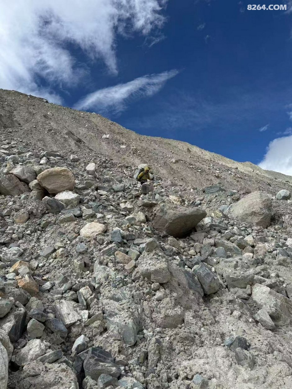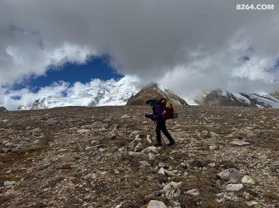 今天因为要翻垭口,3人便早早的起了床,还有个原因是郭如措营地的风实在太大,呼呼的刮了一晚上,其实大家也没怎么睡好。9点半便拔营出发,过了河以后便开始一路爬升,走了不远以后便看见后面跟来了一个队伍,一共5个人,我们行进速度不是很快,很快在一个休息处2个队伍便相遇了,健哥友好的同他们领头的人打招呼问说你们是29号进山的哇(因为前面2天我们都没看见山下有车进山或者队伍跟随),领头的人竟然直接无视了也不回应,此时我心中就有点不爽了,感觉这也太傲了吧,随后大家也就相互擦肩而过,互相都未搭腔。后续还是老规矩,无限的碎石坡,爬升爬升,前面遇到的队伍开始了分化,他们一行5人中的3个人开始猛猛的向前冲着,后面跟着的2个人开始有点力不从心,尤其是最后一个老哥(我们后面称他为“外挂哥”)吸引了我们的注意,他背了一个不像是很专业的重装包,包上外挂了满满的杂物,而且竟然还把最重要的睡袋外挂在 背包下面,而且整个人不知道是由于身体状态不好还是背包的原因,走路十分吃力,尤其是到爬升的中后途频繁的需要弯腰来减轻肩膀的压力,但是好在虽然走一段歇一段,“外挂哥”还是稳稳的向前推进着并没有放弃,不过令我们有点咋舌的是,到了后面由于他们前面几个人走的太快,本来倒数第二个人也还不时回头看一下他,后面不知道是为了追赶进度还是啥的,最后也就都没人再等他了,我和彬彬因为健哥状态还没完全适应走的比较慢,我们2个就走一段在前面等着,“外挂哥”基本也都在我们的视线范围内,彬彬都说从来没见过这种队伍不理人就算了,有队友是这种状态了竟然完全不管他蒙头往前走的,要是翻垭口有什么情况前面的人完全都不知道也帮不上忙。