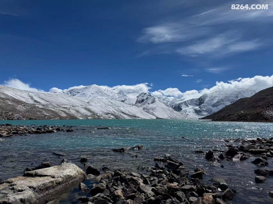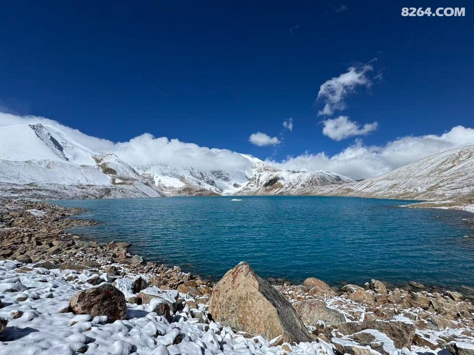 ,今天的打算是休整一天,我和彬彬就准备再轻装翻上山口去再看看郭强措,健哥则留在营地休息,于是我们2个人就慢慢从湖口处往上爬,不到1个小时就翻到了湖边最高的大石头边,由于刚下过雪,天气好的很,蓝天白云,不过可能由于是光线角度的问题,早上的郭强措颜色呈深蓝色,中间有一块巨大的浮冰很是显眼,我和彬彬就坐在石头上静静的享受,风徐徐的吹过湖面竟有种在海边的既视感