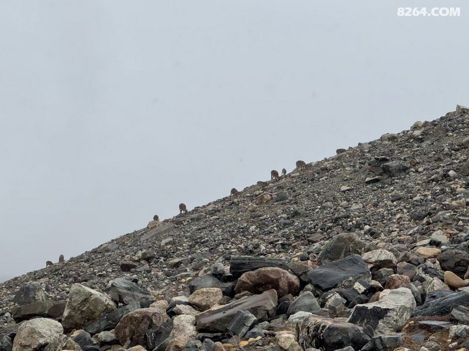 头天扎好营便一直在下雪,早上起来雪竟然还没有停的迹象,我们3个人把包收拾好便在帐篷里面等着雪小一点,大约10点11点的样子昨天的5人队伍途径了我们帐篷,有个北京大哥对我们说雪也不是很大还不如起帐走嘛,我们觉得也是这个道理,哈哈哈哈,于是我们便冒着雪拔营出发了,这次他们5个人倒是一直走在一起的,由于观察了下河谷地形,我们选择的走河谷右侧,5人队选择的走河谷左侧,我们先行来到了切上冰塔林山梁的山脚下抽烟休息,5人队随后也到了这边,领头的小伙子问了下我们的行程,我们说准备宿冰塔林玩玩,后天再翻6000垭口(根据常规路线此处应该继续沿着河谷下降至冰塔林尽头处过河绕开冰塔林),他们后面的人说行程差不多,因为头天的遭遇,我也没过多跟他们说话,2个队伍也就默默的往山脊上直上。爬升的过程中,彬彬说快看左边山上是不是狼哦,我们定睛一看哪是什么狼,是藏羚羊嘛,要是这么大一个狼群怕把我们骨头都吃没了