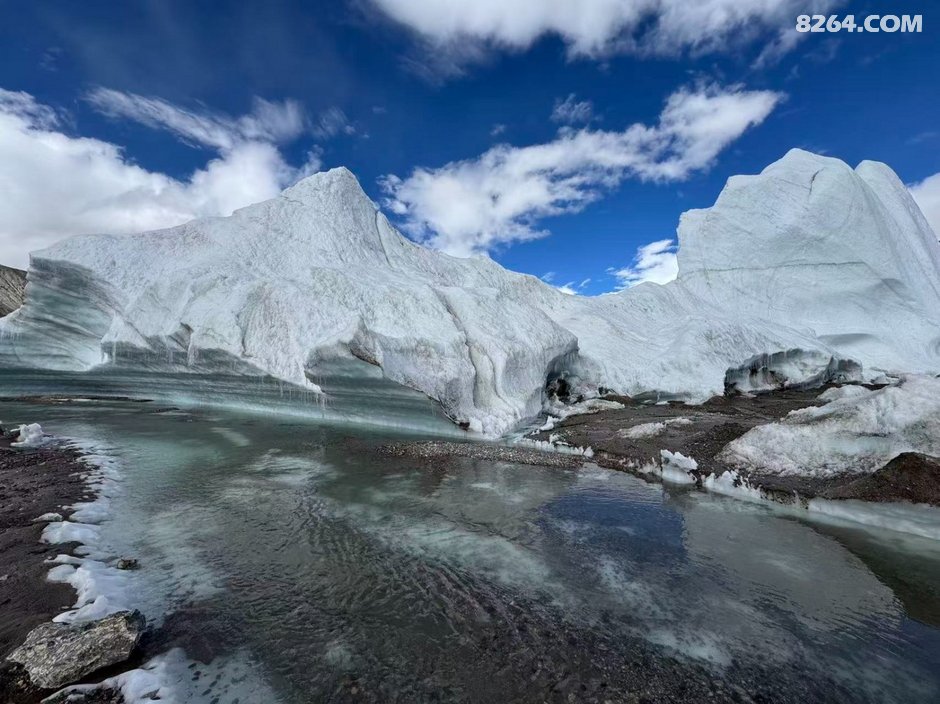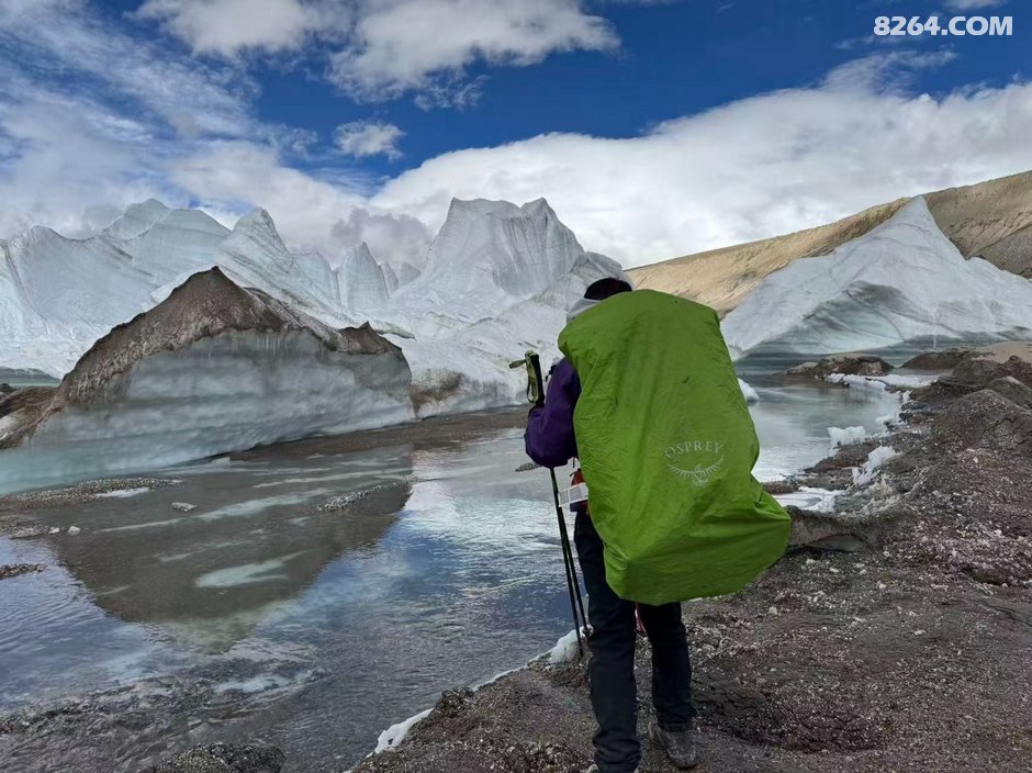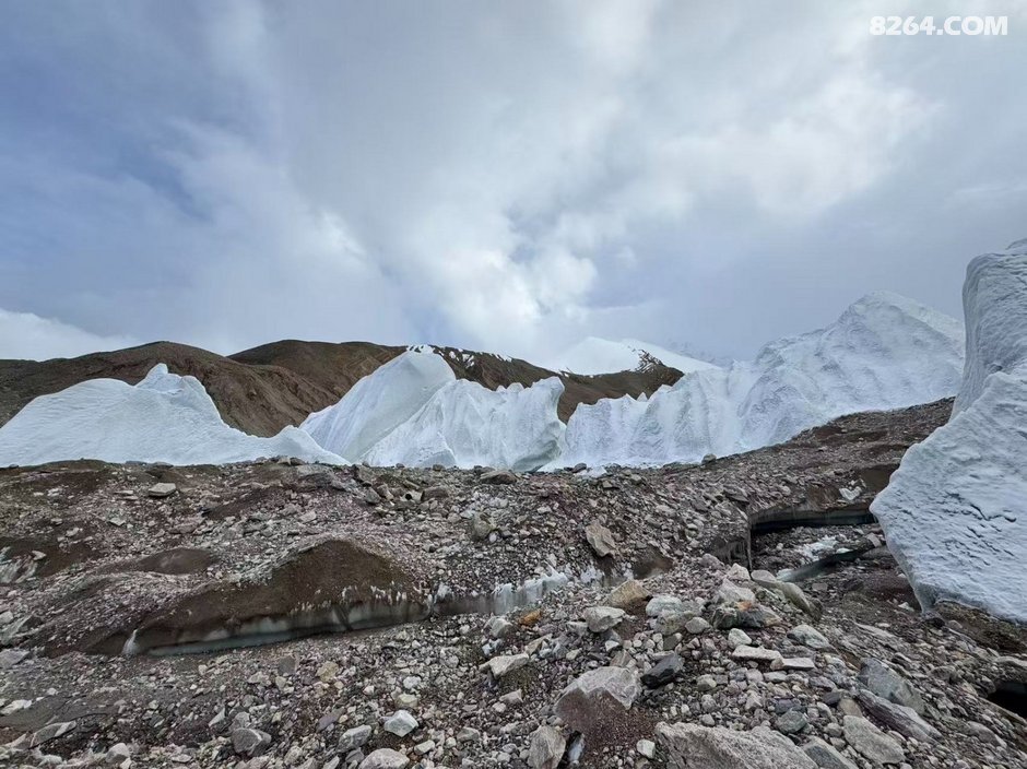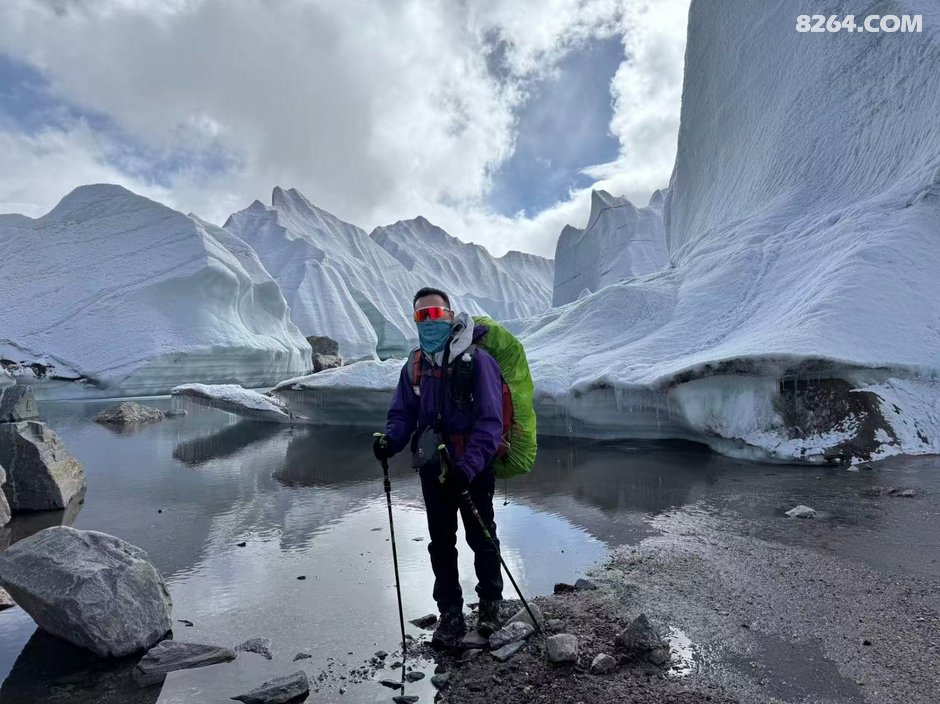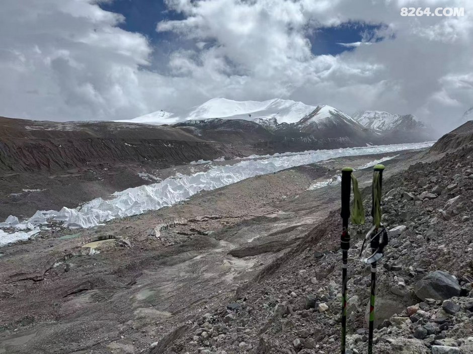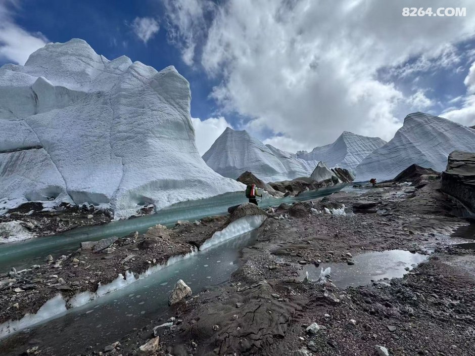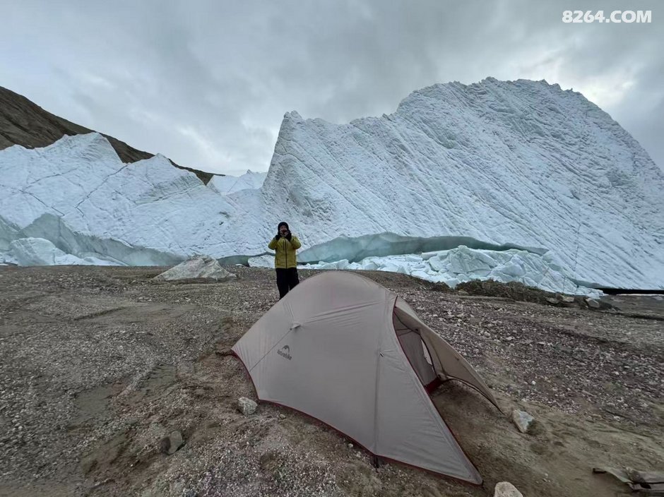 ,一路向下至谷底已经下午5点左右,当时商量了一下,还是先在冰塔林这侧扎营后,轻装先去把穿越路线探好第二天再重装过去比较稳妥,于是我们就在冰塔里边选了个近水源的地方把帐篷扎好,轻装进入冰塔林探路,我们选择的路线是冰塔林和冰碛湖之间的地带,碎石和土都蛮多,地形相较前一条冰塔林也简单很多,主要就是穿过一条环绕的冰河就可以穿越过去,过河点相对也多,在参考轨迹的基础上多方考察还是找到了一个最安全的过河点并且过河后也有安全的线路到达对面山上,于是探测任务也算是顺利完成