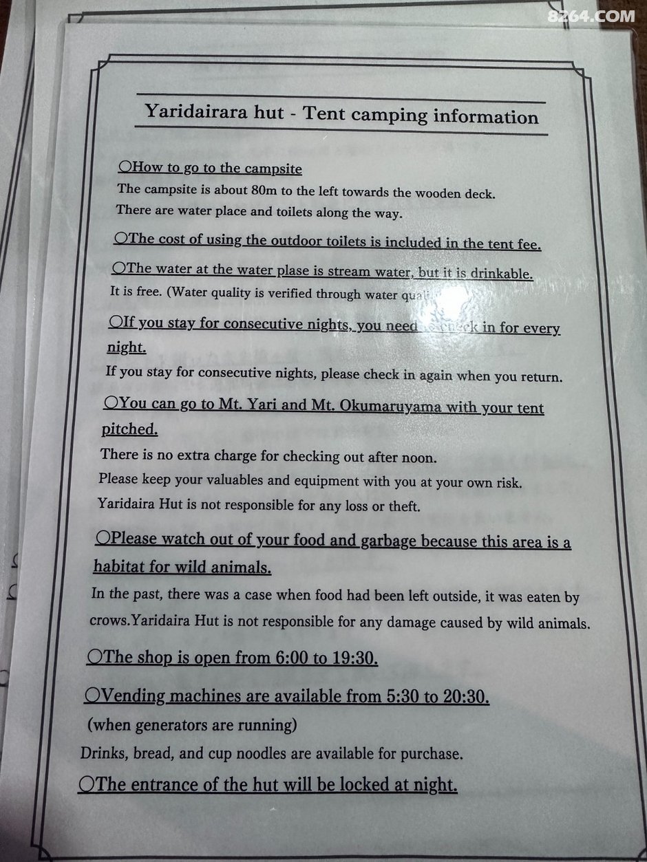 与国内登山徒步相比,虽海拔不如秦岭,风光不如藏地,但对登山健行爱好者宽容态度与服务意识却是绝对领先的。国内各种自然保护区/非景区各山头是频繁封闭各种禁止,防驴友甚于防盗。日本这边国立公园是凭自觉在登山入口处完成进山信息登记(日期、姓名、团队人数、所属山岳队伍、线路计划、装备情况等)。用于统计人流与紧急情况排查,也没有门票。登山者仅有山上食宿花费,可住山屋或扎营,丰俭由人。(住山屋最低是17500 YEN,扎营2000 YEN)