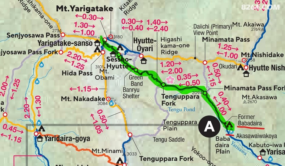 这是今天计划线路,连续爬升,目的地是枪岳山庄营地。 官方网站的地图上明确标记了路程的难易程度、时耗、水源等信息。