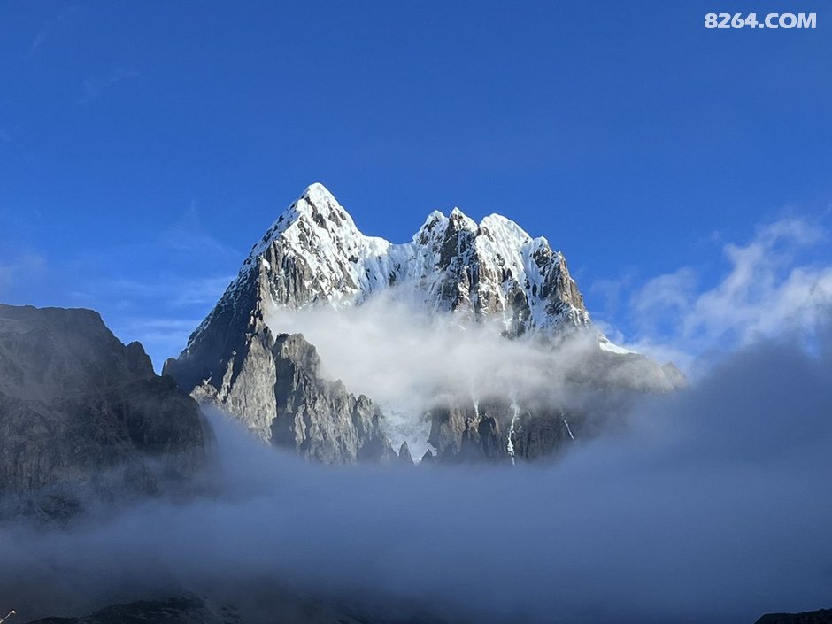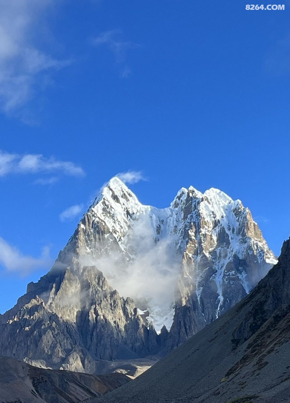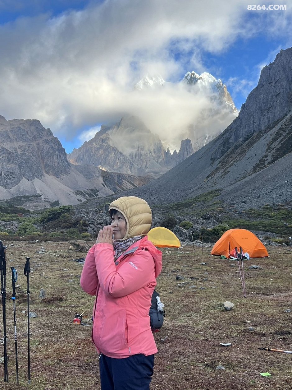 第四天,清晨醒来依然没有见到大米勇神山露出真面目,我就祈祷它能听到我的心愿,也许我们的真诚感动到了上苍,不一会儿,一阵一阵大风吹散了它山顶上的蒙纱,它露出了笑容,太神奇了!大家都兴奋地欢呼起来!
