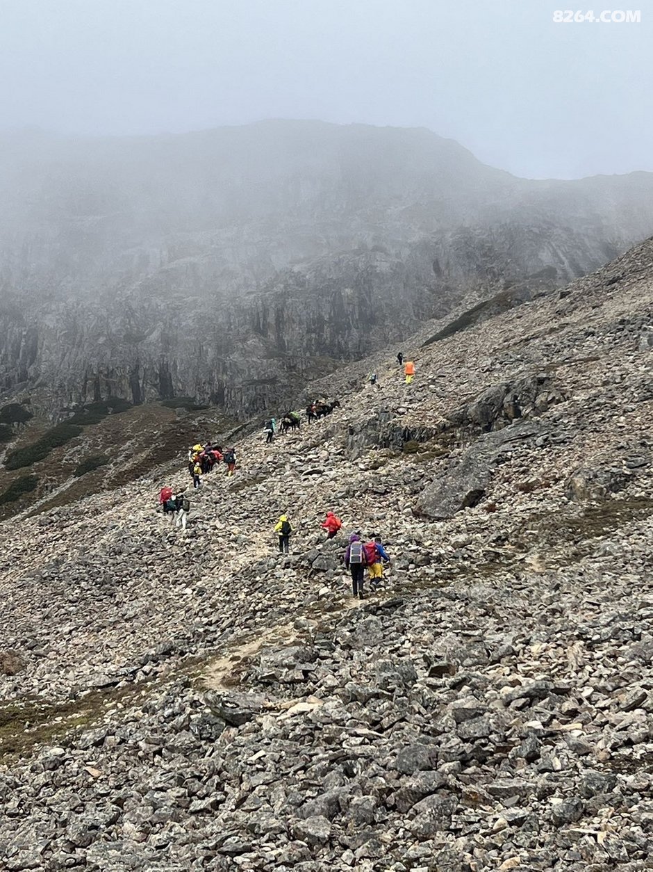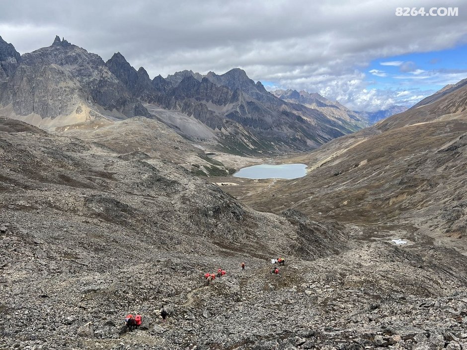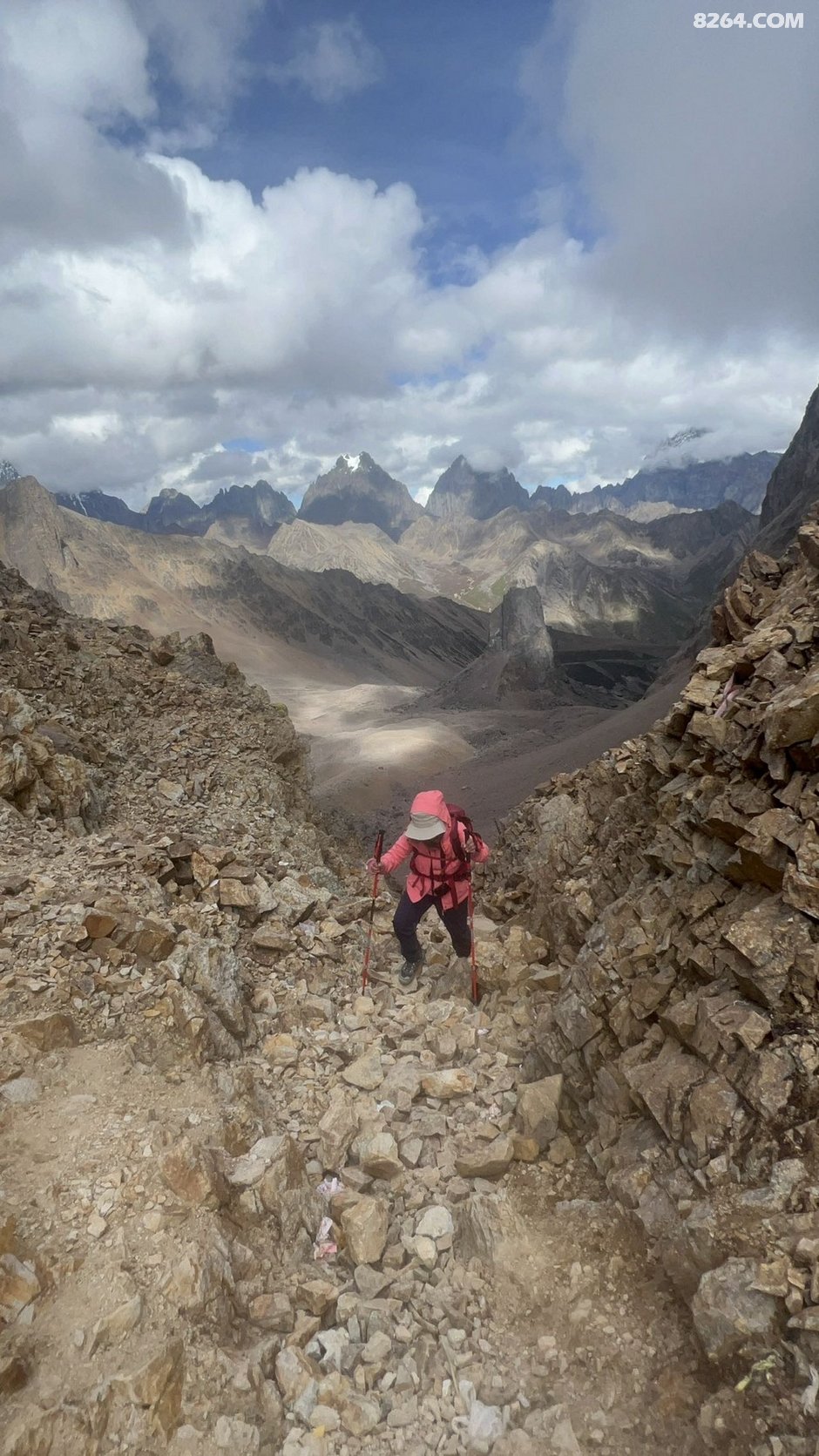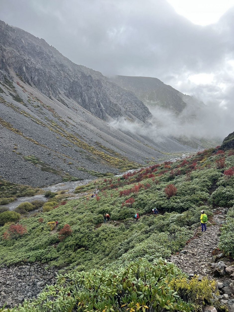第二天吃了早饭,打包好行李,我们8.13分开始起步,只拔高500 米,翻一个 4900 米的垭口,下坡都是碎石坡,下午1.14 分到达营地,全程大约8 公里多,今天翻垭口的状态最好,一呼一吸,不求快。只控制自己的心率不要提高的太快。到营地有太阳,晒 帐篷晒 睡袋一一泡泡茶打打 13 水,看着周边的山头显现出来,乌云吹散了。