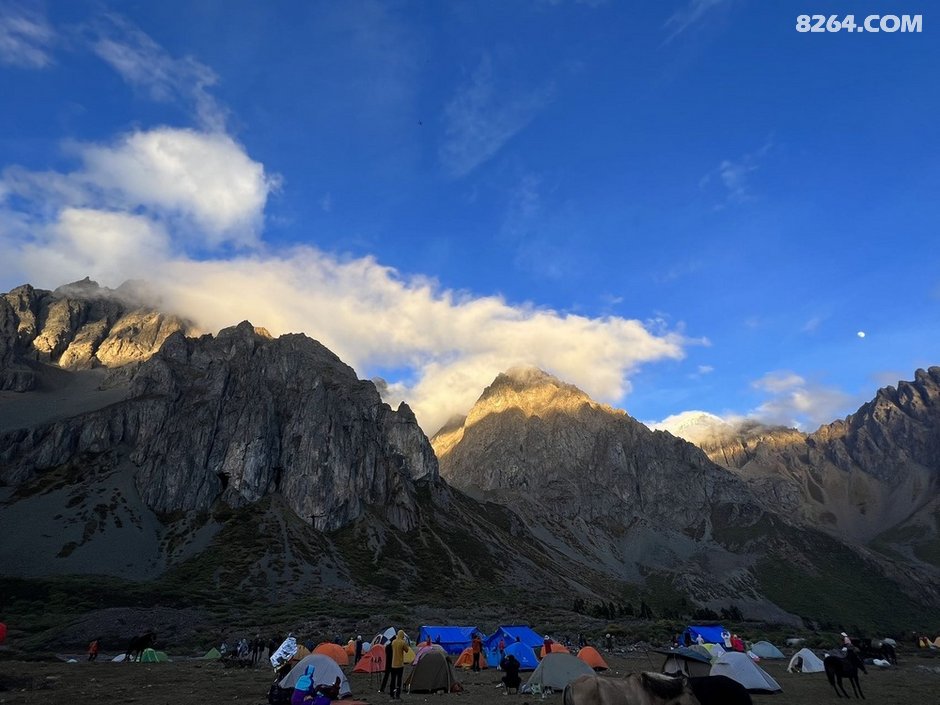 这是第三天,8.28起步,下午13.10到达营地,南加曲隆营地,海拔也在4300,太阳很大,大家晒晒帐篷,睡袋,吃东西,打牌,看到了 日照金山,但大米勇神山山顶乌云笼罩,看不清真面目。