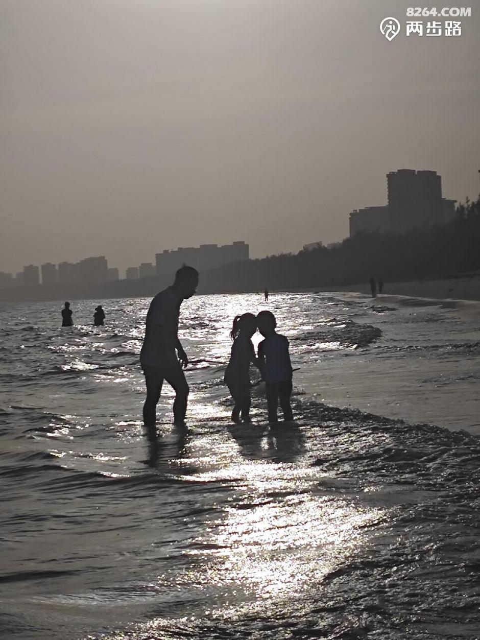 快六点,阳光斜照,游人戏水,海面上浮光掠影,笑语欢声,一派美好。