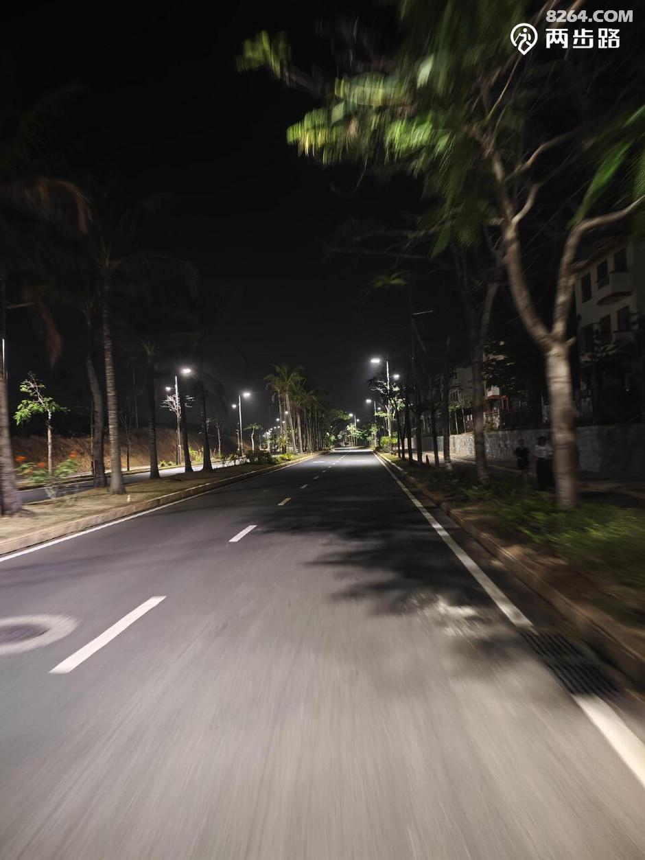 七点半,路过海南海洋水上乐园,灯火辉煌,有如龙宫。听着里面的欢笑声,越发觉得这夜骑有意思。