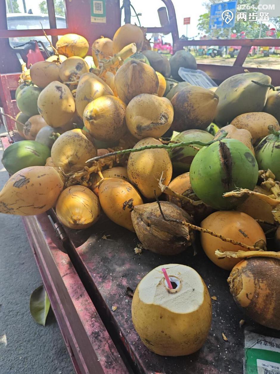 路边水果摊开始出现金黄色的金椰,也比之前路边果摊要好看(本性难移了,但的确属实是不)。