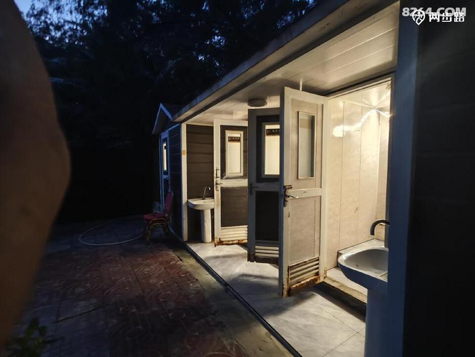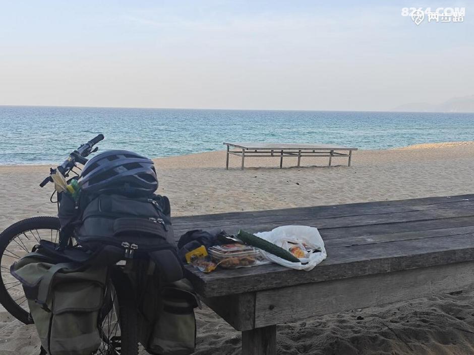 推车下去近看,沙滩、大海,绝佳海景自不用说,这里是一家餐馆,林中、海边有不少餐饮桌椅、木板通道,还有公共厕所,打开龙头,有水,心中大喜,还有比这更完美的露营地吗?