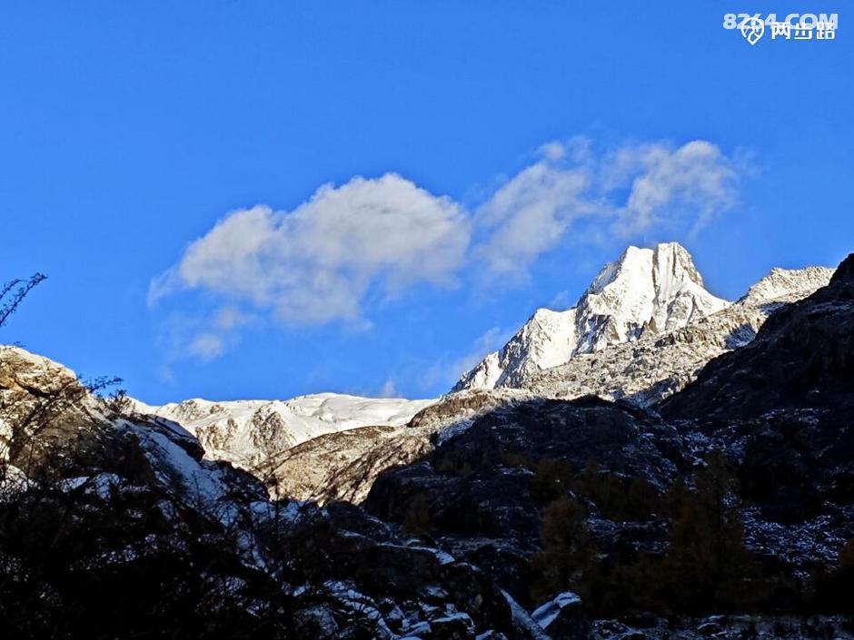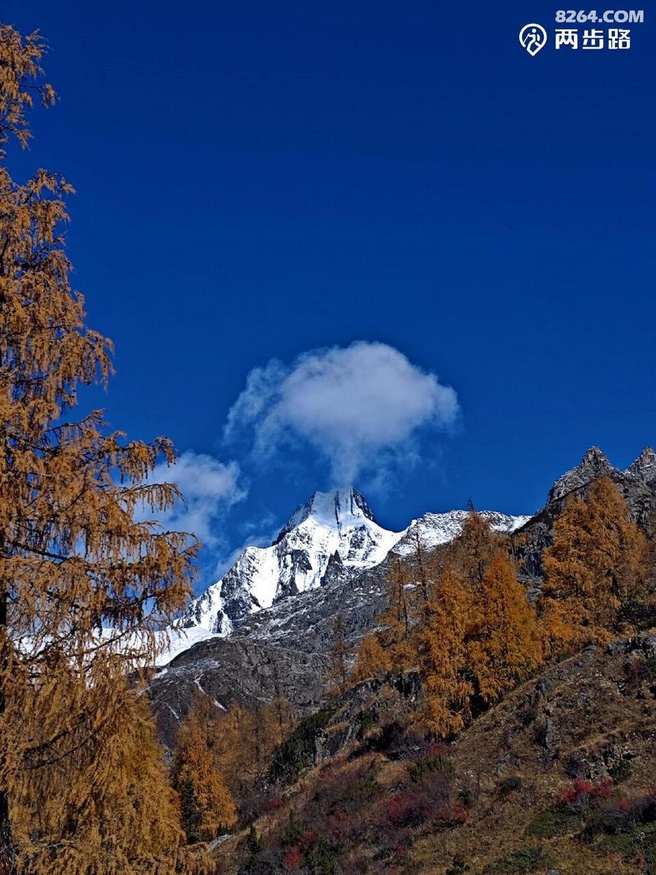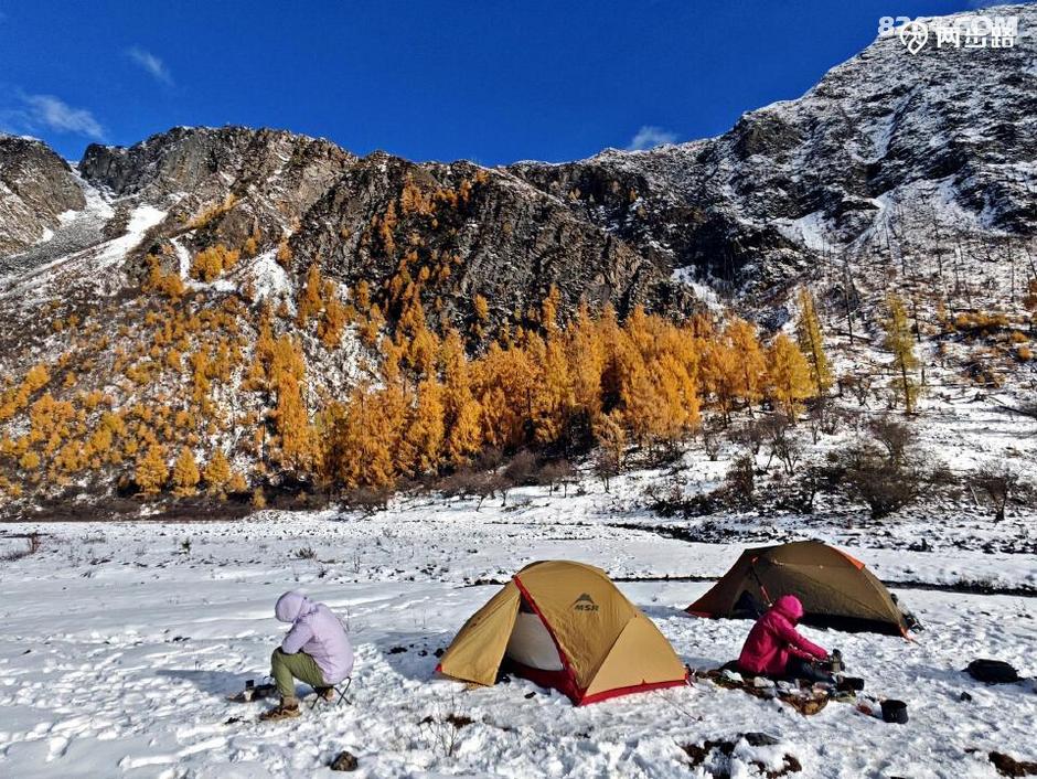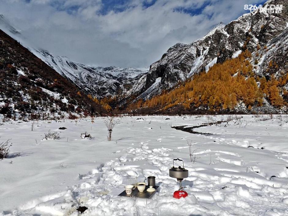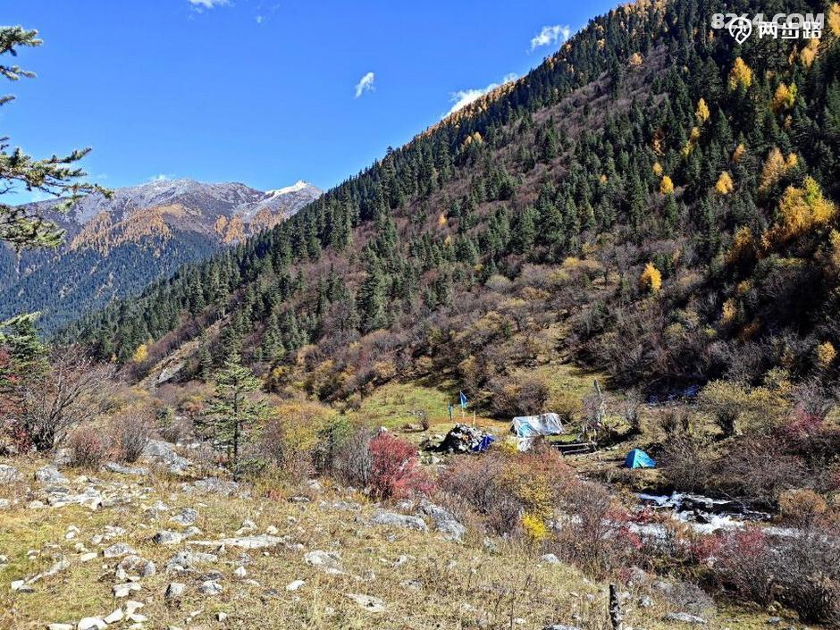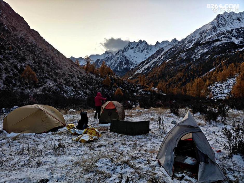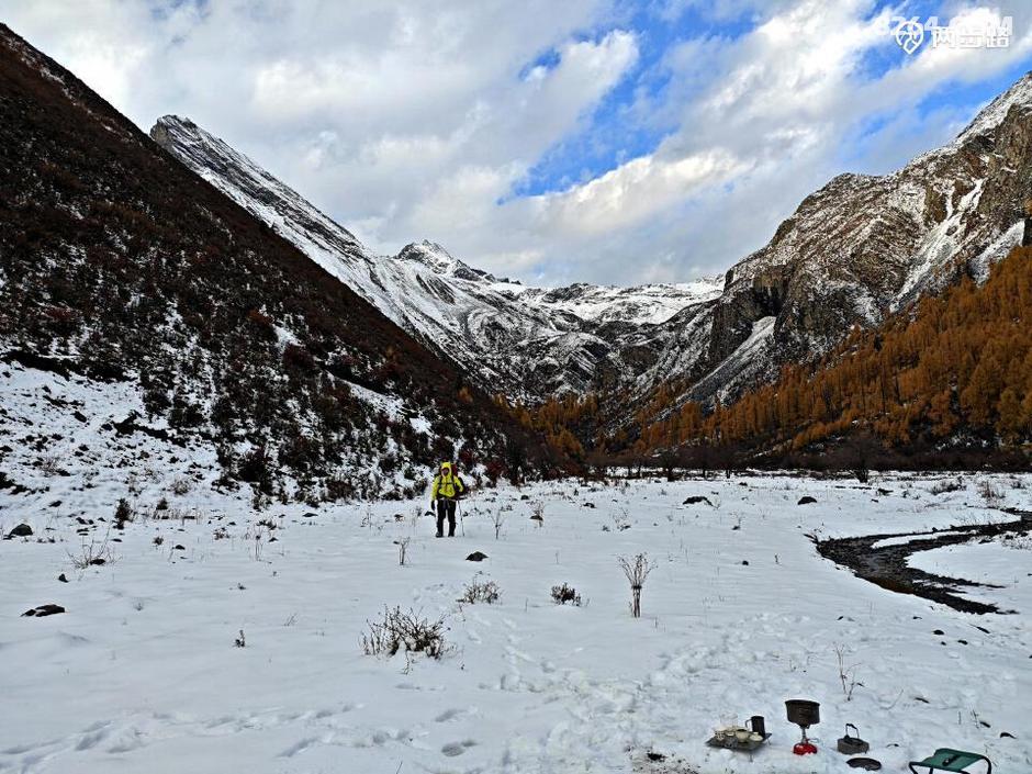因为他们高原适用时间段,休息时间少,今天王总的状态不算好,走到4100营地后,就打算扎营调整。此时还不到中午1点,但我们都没有意见。他们是结伴,自然行停一致,对我而言,人家允许同行等同于收留,自然跟着就行。最关键的是,这块营地条件绝佳,四周雪山白,杉树黄,此时正好转晴,阳光下明暗变幻,如画如屏,大家纷纷拍照,流连忘返,此时的王总要求扎营休息,岂非正中下怀,求之不得?