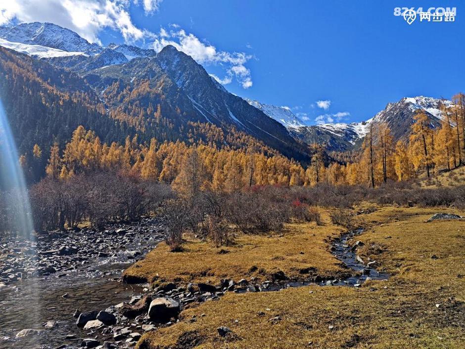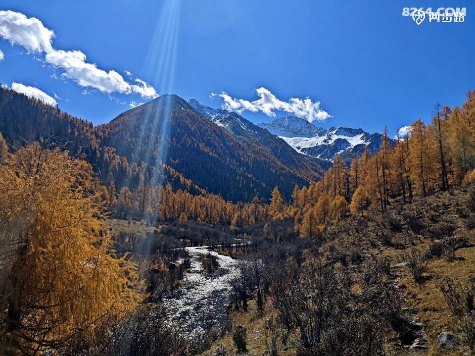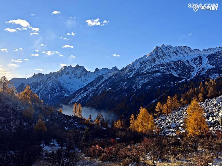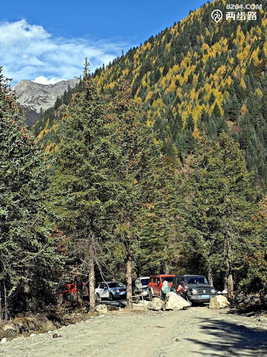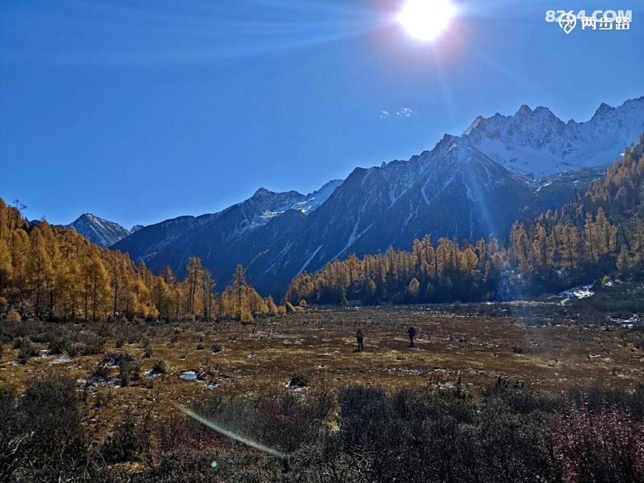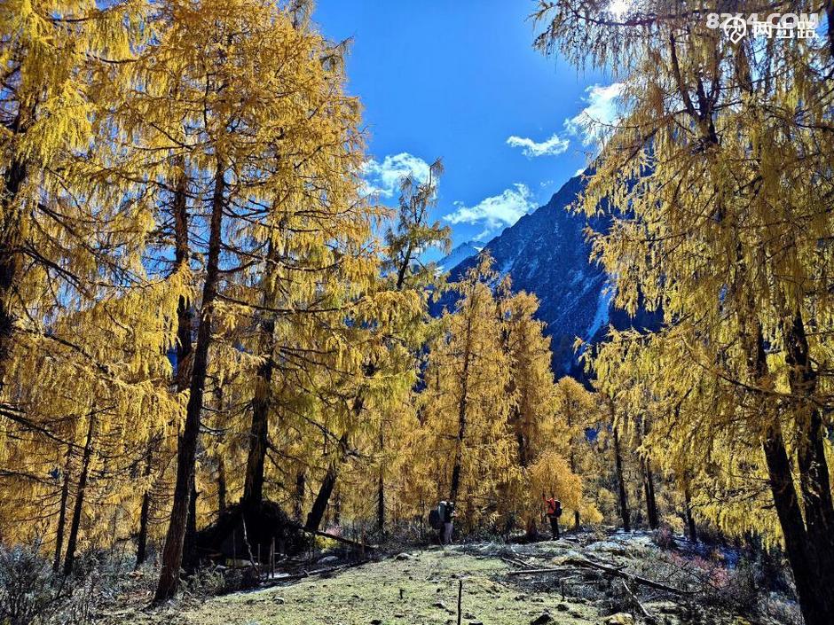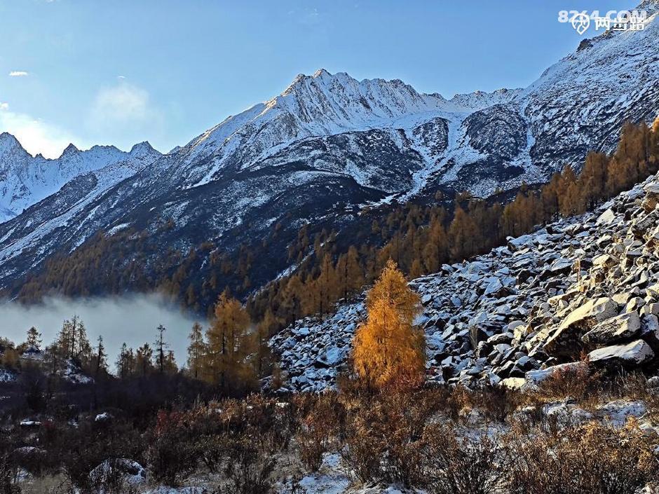 因为他们高原适用时间段,休息时间少,今天王总的状态不算好,走到4100营地后,就打算扎营调整。此时还不到中午1点,但我们都没有意见。他们是结伴,自然行停一致,对我而言,人家允许同行等同于收留,自然跟着就行。最关键的是,这块营地条件绝佳,四周雪山白,杉树黄,此时正好转晴,阳光下明暗变幻,如画如屏,大家纷纷拍照,流连忘返,此时的王总要求扎营休息,岂非正中下怀,求之不得?