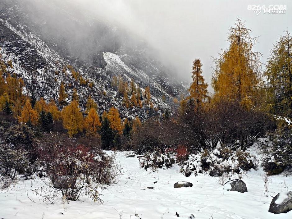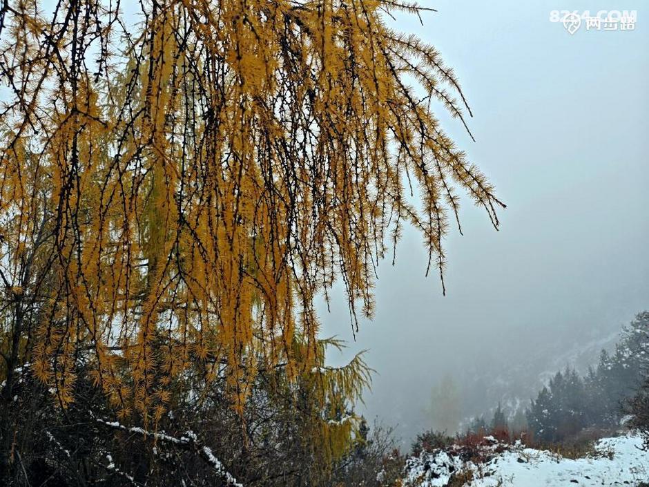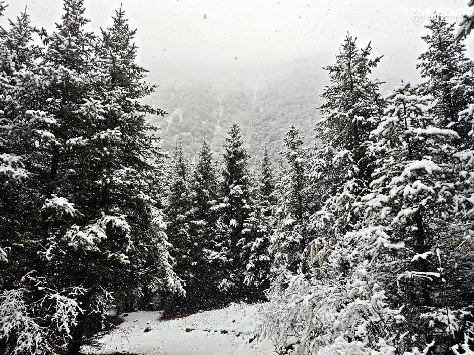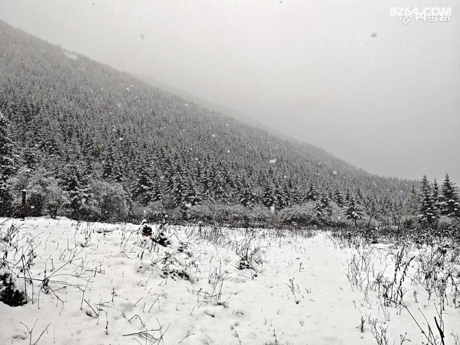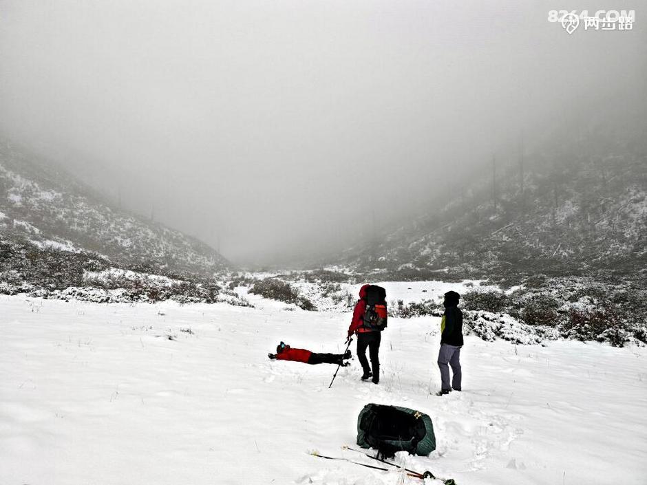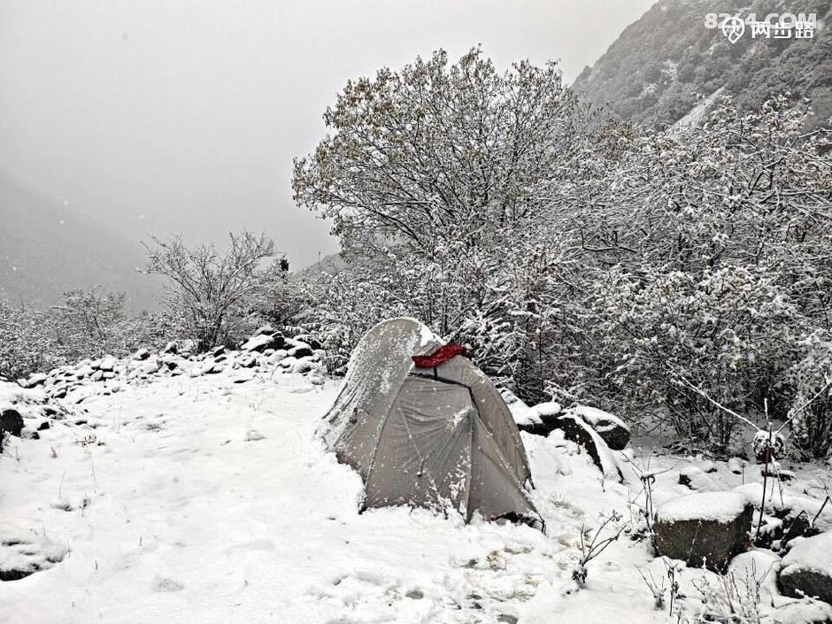 原本查询天气,说此地昨天是多云小雨,结果晴天丽日的,说今天是多云转晴,结果一夜大雪。天亮我就钻出帐篷,嗬!原本的五彩山谷水雾弥漫,天地灰白,雪花依然洋洋洒洒,没有停歇的迹象。
