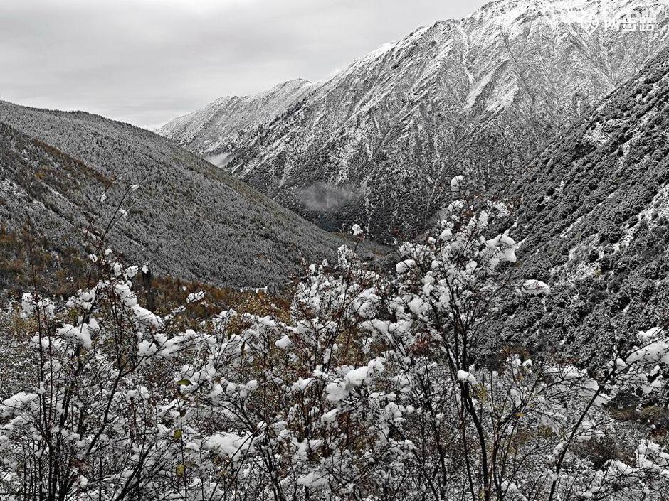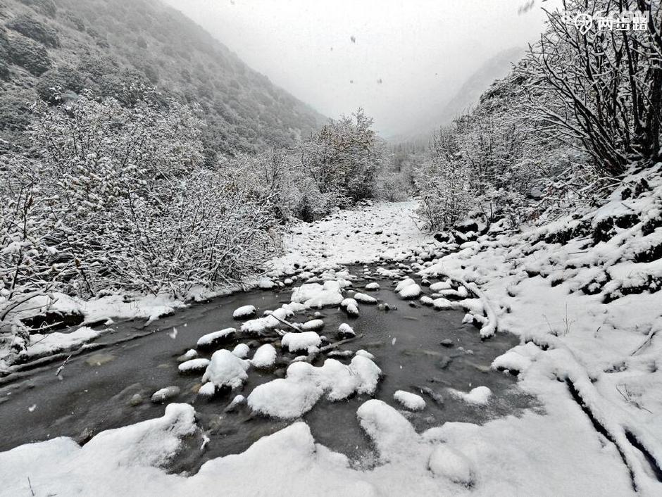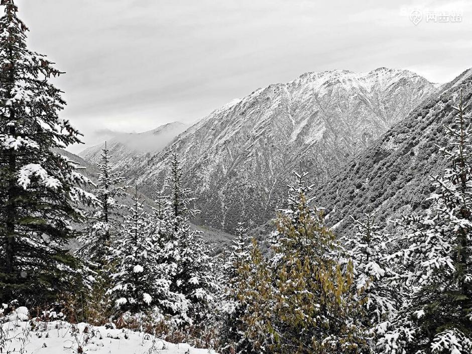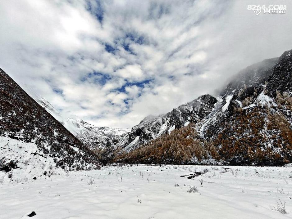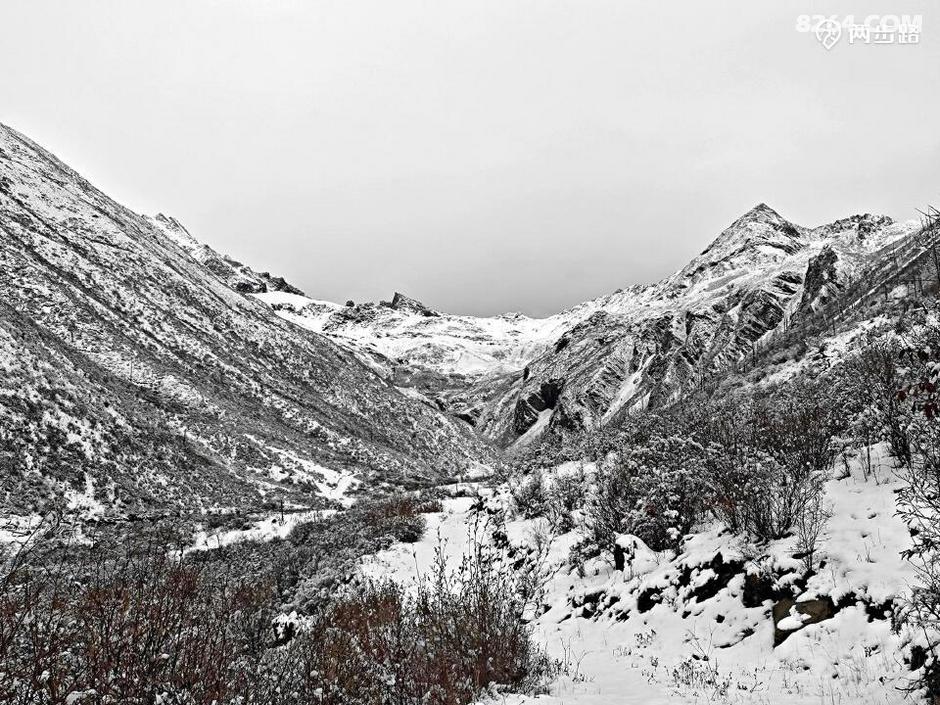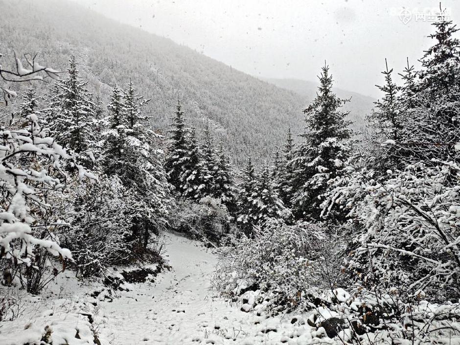 原本查询天气,说此地昨天是多云小雨,结果晴天丽日的,说今天是多云转晴,结果一夜大雪。天亮我就钻出帐篷,嗬!原本的五彩山谷水雾弥漫,天地灰白,雪花依然洋洋洒洒,没有停歇的迹象。