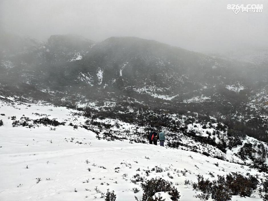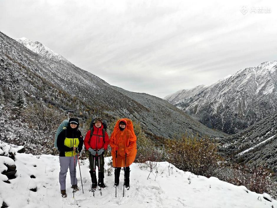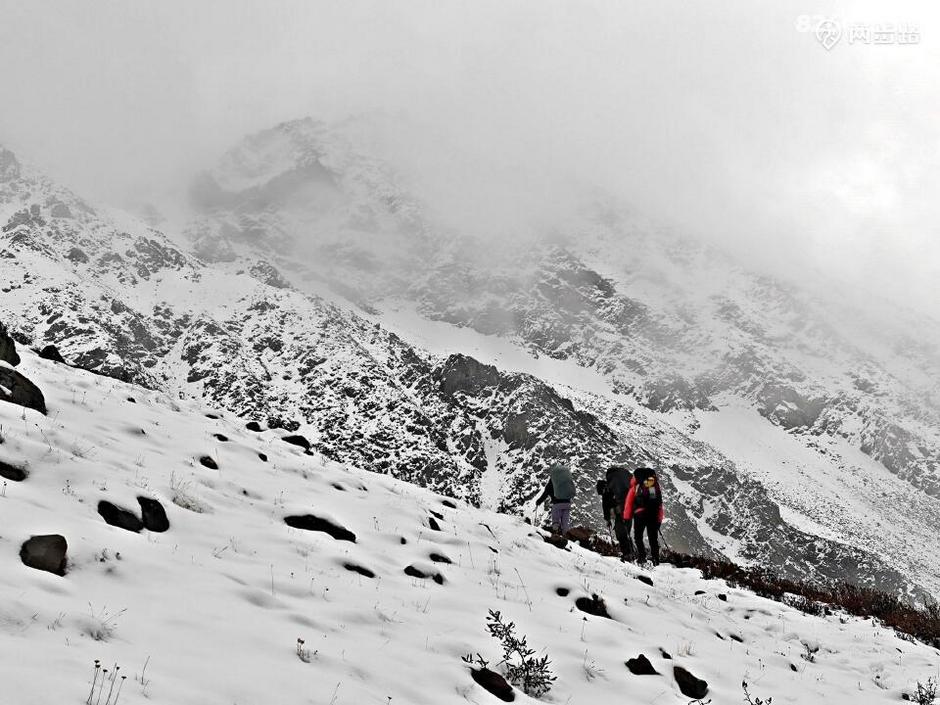 这就是此行遇到的王总、神仙、带子三位,一男两女。我先是惊喜于可以结伴而行,跟他们回头走了一段,后来又担心这个队伍的实力和天气的恶劣,再打退堂鼓,再后来暗骂自己不如人家两位女孩有胆识,哪怕试试不行再退也好啊,于是吃回头草跟他们同行。