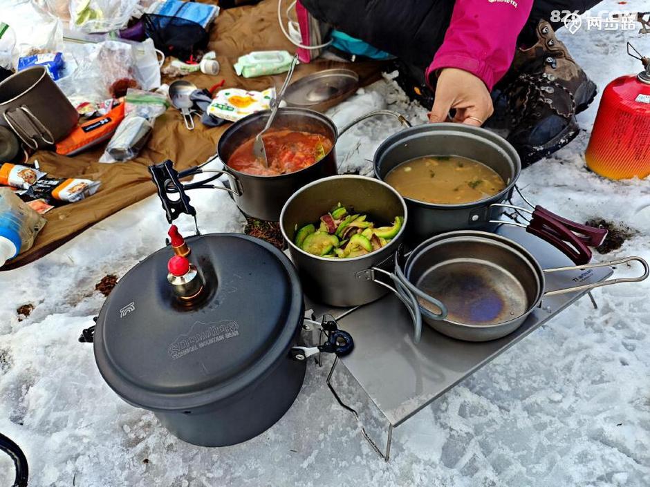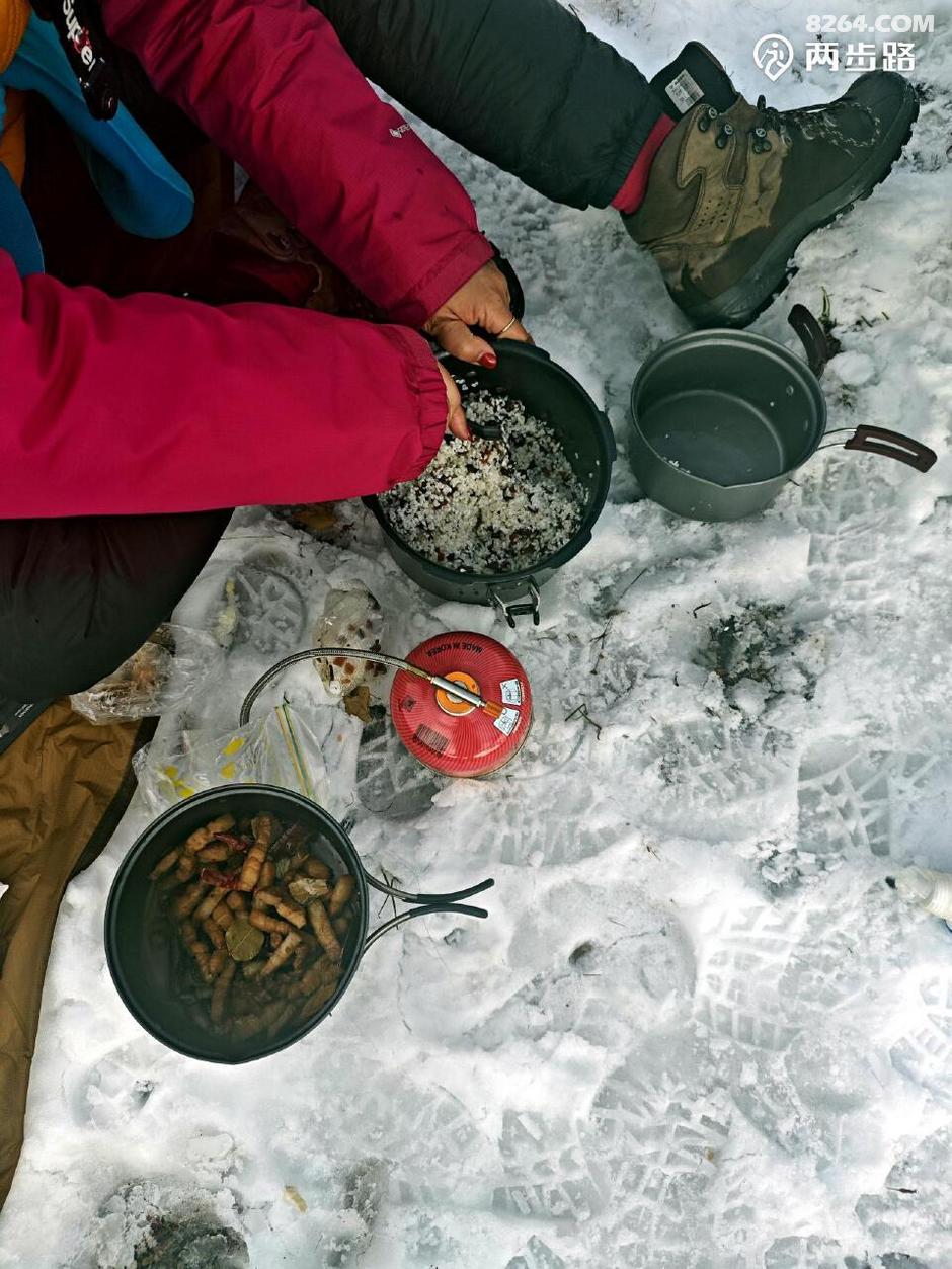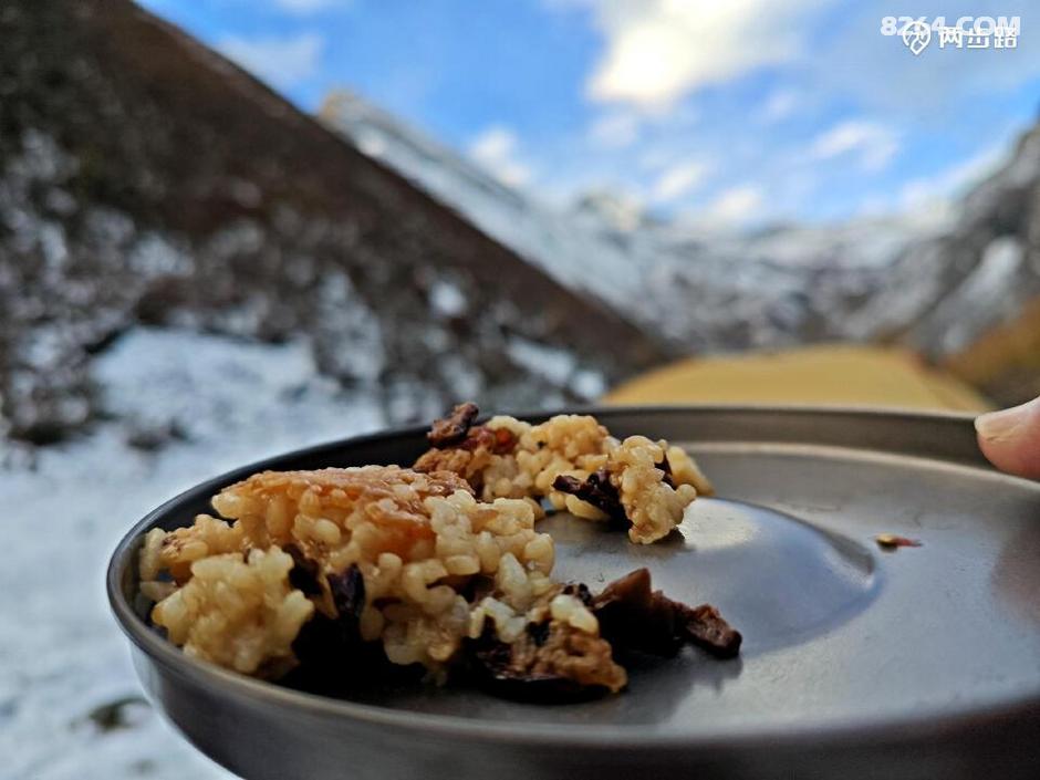 (现炒五花肉,作料一大堆。高原重装吃肉不稀奇,但吃到现炒的,还比很多餐馆都讲究的五花肉,我还是第一次。烟气升腾,肉香四溢,这场景让我都笑起来,你们这哪是徒步,分明是郊游野餐来了。)