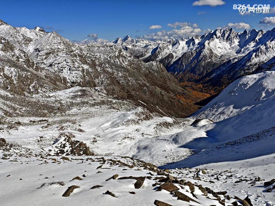 (垭口另一侧,就是直下党岭的山谷。雪山围绕,黄杉嵌底,红黄蓝白,色彩鲜艳又柔和清润,宛如童话世界。)