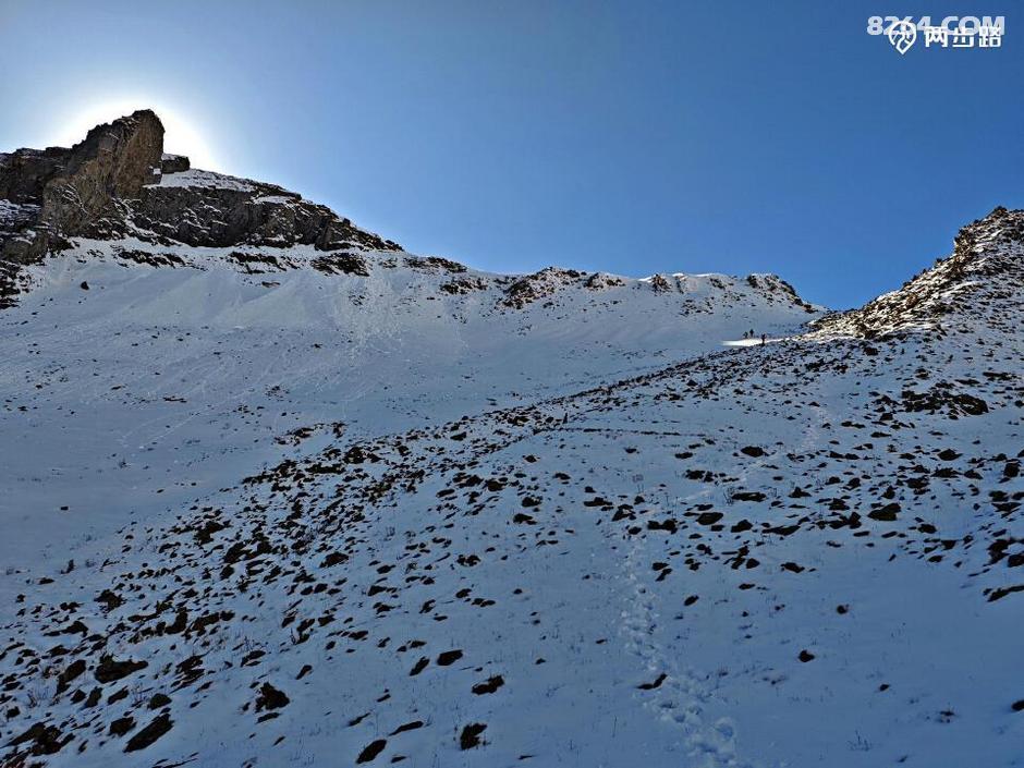 从营地走不多远就开始一路拔高。前天一夜大雪,路迹不明,但昨天那位小伙的脚印在雪上却很醒目,我们后面都不用看轨迹,踩着脚印走,想错都不行。