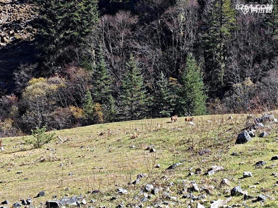 (远处树林,猕猴成群结队,幸好没有过来打劫。)