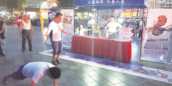 8月7日晚,由自贡市教育和体育局联合主办的2020年自贡市“8.8全民健身日”和全民健身主题月暨体育消费券发放活动启动仪式在自贡市南湖体育中心举行。 自贡体彩全面融入“全民健身日”活动,活动内场气氛热烈,周围群众热情高涨,现场还设有顶呱刮“炫青春行大运”主题即开票体验环节,参会嘉宾与领导以实际行动表达对2021年成都大运会的支持。活动外场,即开销售卖场吸引了大批购彩者,在销售人员的引导下,大家有序购彩,活动期间不断有购彩者传来中奖后的欢呼声。 乐山:全民健身日体彩邀你动起来