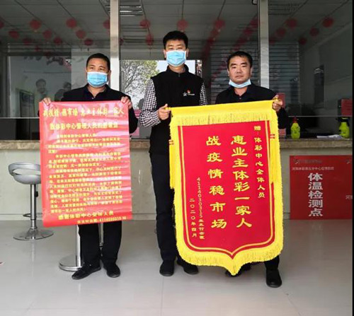 4月22日上午,体彩实体店4114030315代销者付云霞及其家人一行人来到河南省体育彩票管理中心商丘分中心(以下简称商丘体彩分中心)将一面印有“战疫情 稳市场,惠业主体彩一家人”的锦旗送到商丘体彩分中心主任艾海涛的手中。 在新冠肺炎疫情初期,体彩停售时