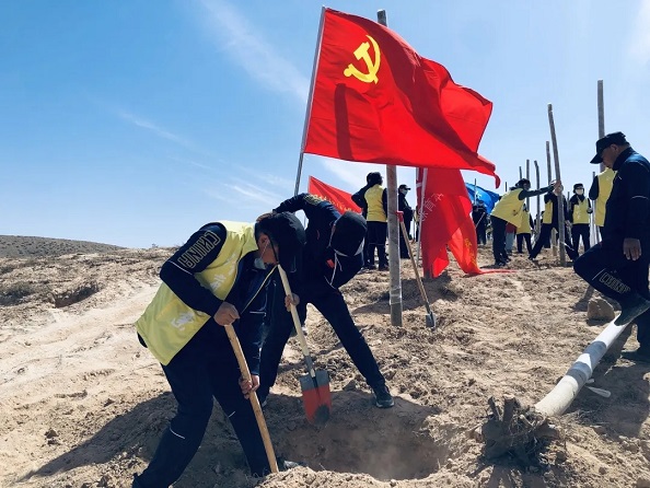 大家首先观摩了白芨滩防沙治沙林场马鞍山分场,参观了中国防沙治沙博物馆和灵武大泉治沙区,从讲解和历史资料中,看到沙漠变绿洲、贫瘠变富有,深切感受到治沙人的艰辛与坚毅;聆听了“人民楷模”王有德同志讲述坚守“生命不息,防沙不止”的治沙初心不动摇,积极践行习近平总书记“绿水青山就是金山银山”的生态发展理念,克服万难、艰苦创业、带领广大干部职工实现沙漠变绿洲,百姓脱贫致富,生活安定幸福的奋斗故事。 主题党日活动还开展了简单而又特别的捐赠仪式,宁夏体彩向防沙林场捐赠了水、遮阳伞、帽子等物资,表达宁夏体彩人对治沙人的敬意。 参加本次活动的宁夏体彩中心全体人员在林场工作人员的带领下,踏寻着习近平总书记植树造林的足迹,开展了一次践行“绿水青山就是金山银山”号召的植树造林活动,为毛乌素沙漠种下一抹抹新绿。 最后,在中国防沙治沙博物馆,全体党员面对着鲜红的党旗,举起右手,庄严地重温了入党誓词。 甘肃:参与公益植树 4月23日,甘肃省体彩中心在临洮训练基地进行主题党日公益植树活动,中心全体党员、中层干部及群众代表参加活动。