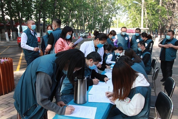 准备献血的干部职工和代销者戴着口罩,保持安全距离。测量体温、填写登记表、测量血压、抽血化验……所有流程在血液中心医生的指导下井然有序进行。