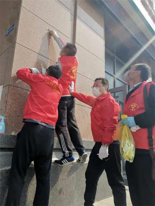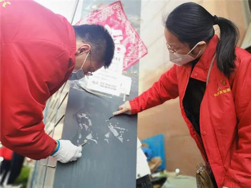 随后,在黄鹤彬主任的带领下,体彩中心的志愿者们,拿着壁纸刀、抹布、喷壶等工具,对社区周边墙体上张贴的小广告和地面上的杂物进行了清理。看到志愿者们热火朝天地劳动着,一些热心的社区居民也纷纷拿来工具,加入到清洁队伍当中,几个小时的清洁活动,让整个社区焕然一新。
