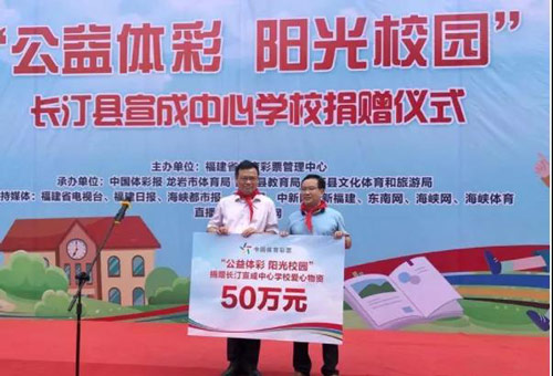 6月1日上午,“公益体彩 阳光校园”走进福建长汀宣成中心学校,在这里,福建省体彩中心给孩子们捐赠了冬夏校服、书包、课桌椅、篮球架、乒乓球和球拍、羽毛球和球拍,以及教学用的音响、电脑等价值近50万元的物资,为他们过一个特别的儿童节。 出席本次活动的嘉宾有福建省体育彩票管理中心副主任傅志忠、龙岩市体育局二级调研员欧阳骥、长汀县常务副县长刘演昌等,并得到了福建日报、东南网、福建省电视台、海峡网等十多家媒体的支持。
