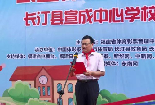 福建省体彩中心副主任傅志忠为本次活动致辞,他表示,一直以来,福建体彩中心从革命老区和苏区入手,对经济欠发达的边远山区学校捐助款项,以此来补充边远山区学校教学物资的不足。宣成中心学校所在的长汀县宣成乡是开国上将杨成武将军的故乡,这里景色优美,民风淳朴,有着杨成武将军故居和多个红色景点。“公益体彩阳光校园”项目在此捐赠近50万的物资,是历年来捐赠价值最大、参与媒体最多的一次,具有里程碑意义,福建省体育彩票在资助边远地区学校方面又迈出了长足的一步。 长汀县文化体育和旅游局党组书记、局长范元丰在致辞中表示,在即将迎来中小学、幼儿园全面复学复课之时,福建省体彩中心向长汀县宣成中心学校捐赠物资,是助力该校全面复学复课、提升教学质量的及时雨、大礼包,更是新时代扶贫扶智的生动体现,为助力长汀教育发展,改善受助学校办学条件,让学子受益成长养分的慈善之举。