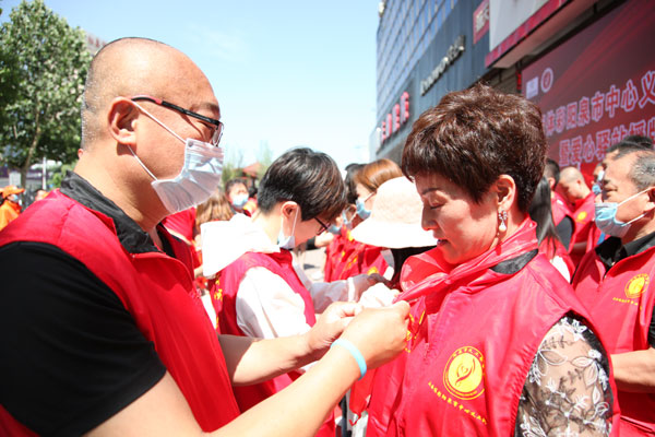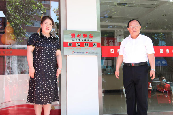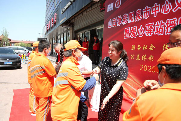 老义工为山西体彩阳泉义工队队长王竞佩戴红领巾 新义工入会仪式结束后,举行了山西体彩阳泉义工队成立仪式。阳泉市义工联副会长李凯将队旗授予了体彩阳泉义工队队长王竞。此次体彩义工队的成立,是体彩人培育和践行社会主义核心价值观,弘扬志愿精神,促进精神文明建设的一项具体举措,旨在发挥体彩公益事业的优势,广泛开展志愿服务活动,扩大体彩公益品牌的影响力。阳泉市体育局党组书记、局长姚文新在仪式上致辞,对山西体彩阳泉市义工队的成立,给予了充分的肯定和鼓励,他希望大家一定要脚踏实地,矢志不渝的坚持“奉献、友爱、互助、进步”的志愿精神,立足体彩行业,发挥自身特长,量力而行,讲求实效,持之以恒,与时俱进,不断提高服务层次和水平,把义工行动更广泛深入、更有成效地开展下去,推动阳泉市体彩销售工作取得新的更大的业绩。 省体彩中心副主任张淑英与阳泉市体育局局长姚文新,共同为1403011024号体彩实体店的爱心驿站揭牌,并为环卫工人送上一份夏季消暑的爱心礼品。体彩实体店兼具爱心驿站,面向社区居民、环卫工人、外卖快递员等群体提供临时休息、饮水供应、手机充电等便民服务功能,将公益触角延伸到大街小巷,使得公益更加亲民,更接地气,与老百姓的生活靠的更近。体彩驿站就像一所爱心桥梁,将汇聚的爱心传递给千家万户。