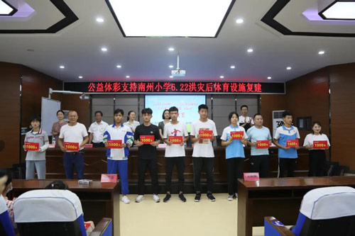 洪水无情,体彩有爱。在得知南州小学受灾情况后,市体彩中心立即决定与綦江区体育局联合对南州小学灾后重建进行捐赠。今天,在仪式现场,市体彩中心与綦江区体育局分别向南州小学捐赠5万元,用于学校体育设施复建,守护孩子们的“体育梦”。 点亮“心”希望 20名体育苗子获资助 仪式现场,重庆市体彩中心除了向南州小学灾后重建捐资外,还通过“体彩助训·春苗行动”向綦江区20名体育后备人才发放了支持资金,激励他们继续努力,为全市竞技体育争光。