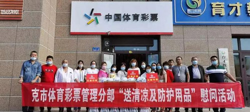 进入夏季以来,新疆各地、州、市气温快速升高,部分地区最高温度可达40度以上。实体店销售员是体彩大家庭中最基层的一员,他们常年奋战在第一线,服务购彩者,为公益体彩事业默默奉献力量。 日前,新疆各地州市体彩机构通过送清凉、送防疫物资等多种形式,关爱销售员、慰问实体店。同时,作为国家公益彩票,活动期间对警务执勤、环卫工人、社区干部进行慰问,充分体现体彩“来之于民、用之于民”的公益宗旨。 克孜勒苏柯尔克孜自治州