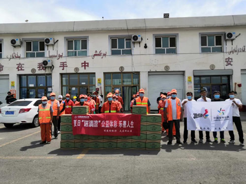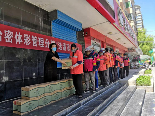 喀什地区体彩管理分部为各实体店、部分警务站、社区、环卫工人送去了降温、防暑物品,还送去了防疫物资,各实体店代销者感受到一份份关心和一次次关怀,都感到无比的开心,大家也纷纷表示会再接再厉为体育彩票事业发展奉献一份力量。 为他们送上防疫物资及防暑饮料,在送去夏日清凉和同时,也送去了关心、关怀。同时,还向辛勤工作在一线,给我们城市变得干净、舒适的环卫工人送去了一份夏日的清凉。 哈密市