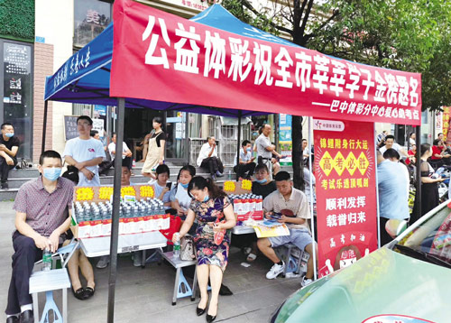高考期间,四川巴中体彩中心组织体彩代销者分别在巴中四中、龙湖中学、通江中学和平昌中学四个考点支起凉棚,摆放清凉饮料、防暑用品和公益金使用展示卡片,为考生提供防暑降温用品,为家长搭建清凉舒适的陪考环境。在送孩子进入考场后,家长们纷纷进入休息点,或喝茶聊天,或了解体彩公益金使用情况。