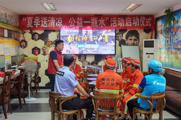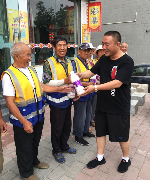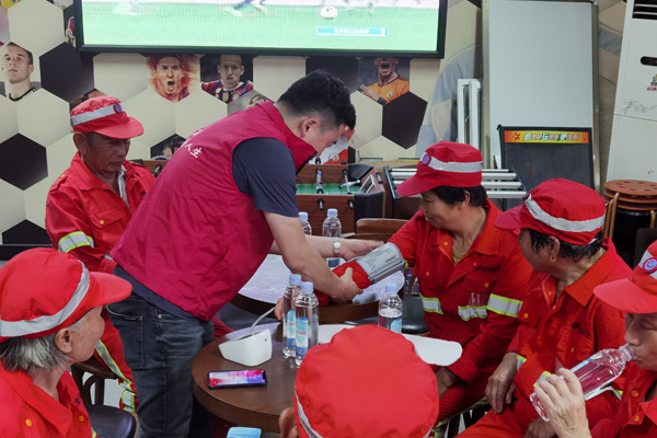 大暑,指炎热之极,是一年中最热的节气。暑天来袭,酷热难耐,全国各地体彩人纷纷行动,慰问高温下坚守岗位的环卫工人、交通警察、快递小哥等一线劳动者,同时也给困难群众送去丝丝凉意,献上诚挚关怀。炎炎夏日中,体彩用暖心之举,使人们感受到一抹沁心的清凉。 喝了饮料,感觉不热了,干活有劲了 “感谢洛阳体彩一直牵挂着俺们环卫工人,天再热,喝完这瓶饮料也感觉不热了,干活也有劲了。”在河南省洛阳市伊滨区诸葛镇的10015体彩实体店内,环卫队队长王志标与7位环卫工人一起免费领取饮料后,笑着说道。 日前,洛阳体彩在全市6区9县同时开展中国体育彩票“捐助环卫 爱心公益”活动,洛阳各区县环卫工人到任意一家体彩实体店通过扫码登记,可免费领取1.45升植物蛋白饮料一桶。捐赠数量为15000桶,价值约27万元。